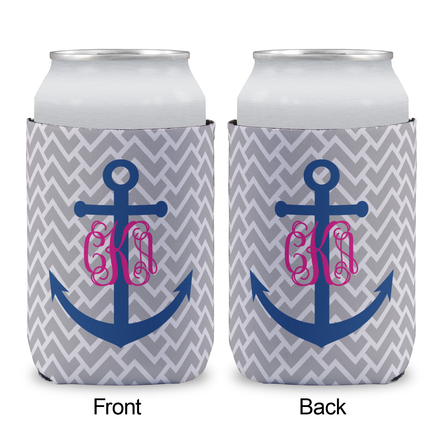 This design perfect for someone who loves anchors and monograms. In this beautiful design, we features a zigzag pattern for the background. We chose a neutral light gray color. For the foreground we chose a simple anchor in blue and we added an interlocking monogram in hot pink on top of the anchor.