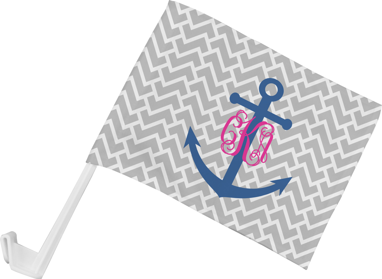 This design perfect for someone who loves anchors and monograms. In this beautiful design, we features a zigzag pattern for the background. We chose a neutral light gray color. For the foreground we chose a simple anchor in blue and we added an interlocking monogram in hot pink on top of the anchor.