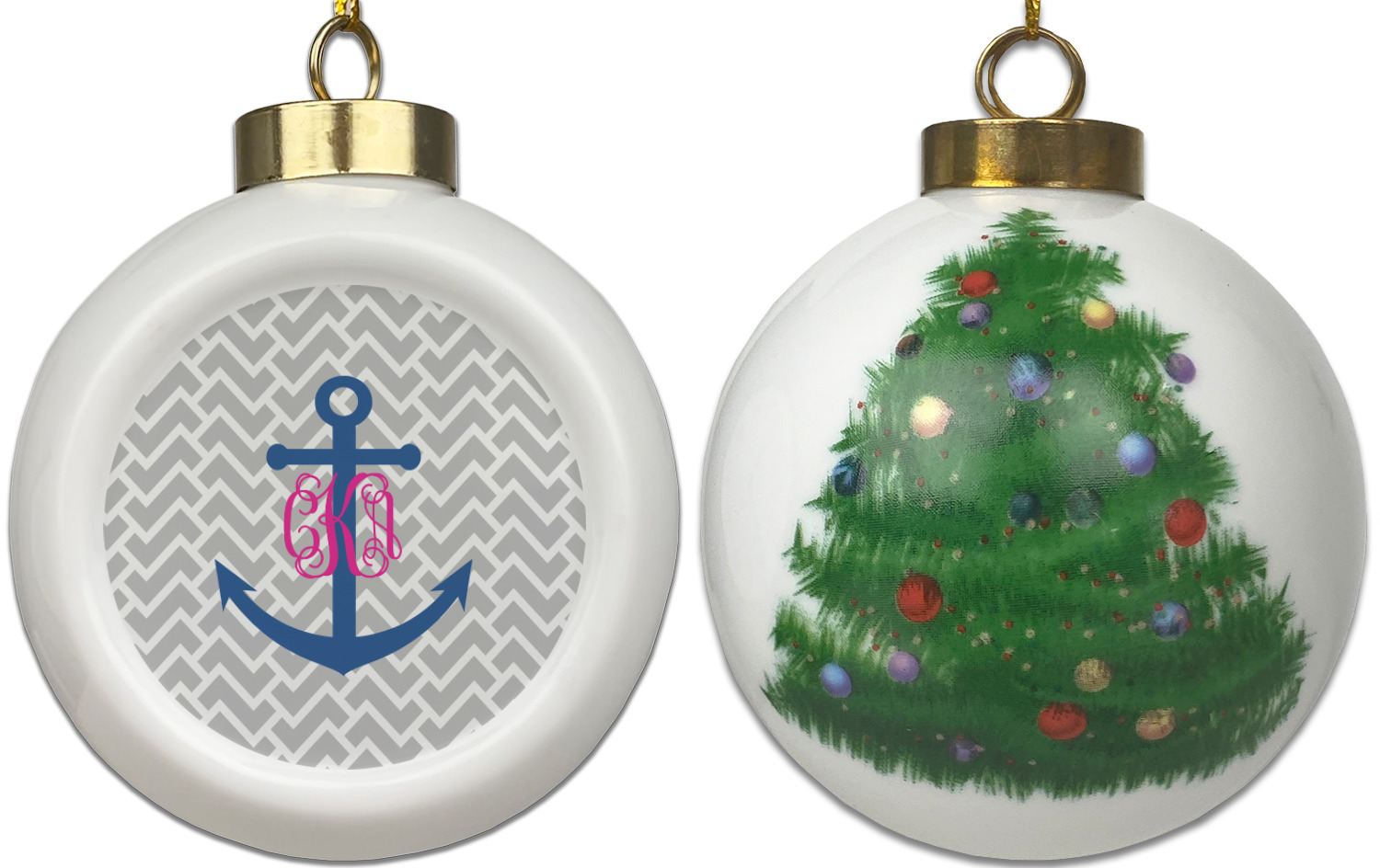 Our Christmas ornaments are a unique ceramic ball shape with a twist as it has a flat face to display your custom design! Select from one of our two design types - Christmas Tree or Poinsettia Garland - to adorn the curved back of your personal design. Each ornament measures 3H x 2.5W x 2D accompanied with a gold string accent for finishing touches to hang on your beautiful Christmas tree!