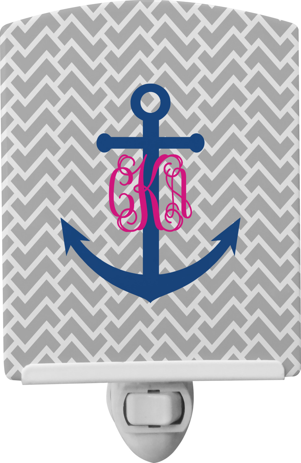 This design perfect for someone who loves anchors and monograms. In this beautiful design, we features a zigzag pattern for the background. We chose a neutral light gray color. For the foreground we chose a simple anchor in blue and we added an interlocking monogram in hot pink on top of the anchor.