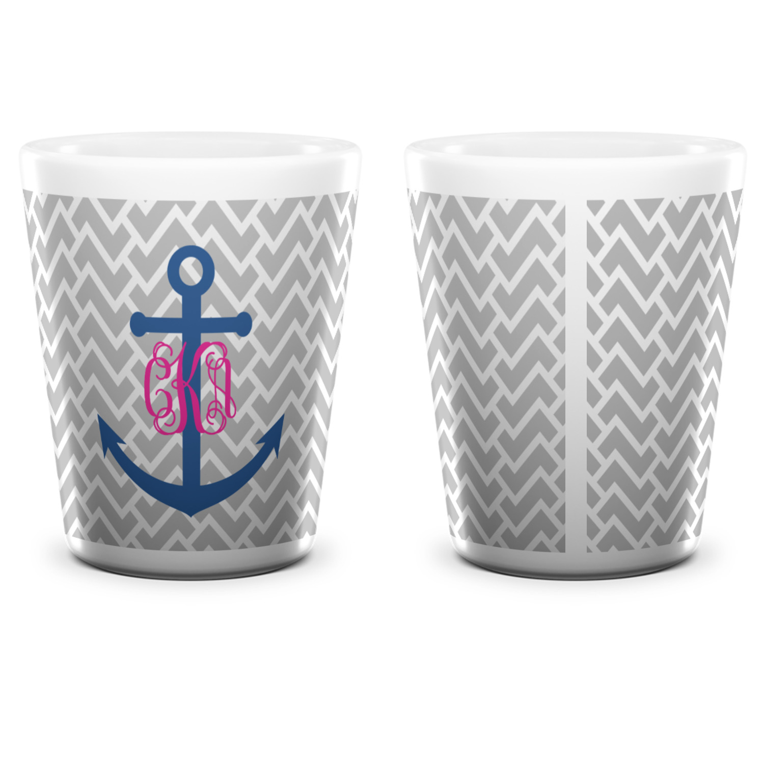 This design perfect for someone who loves anchors and monograms. In this beautiful design, we features a zigzag pattern for the background. We chose a neutral light gray color. For the foreground we chose a simple anchor in blue and we added an interlocking monogram in hot pink on top of the anchor.