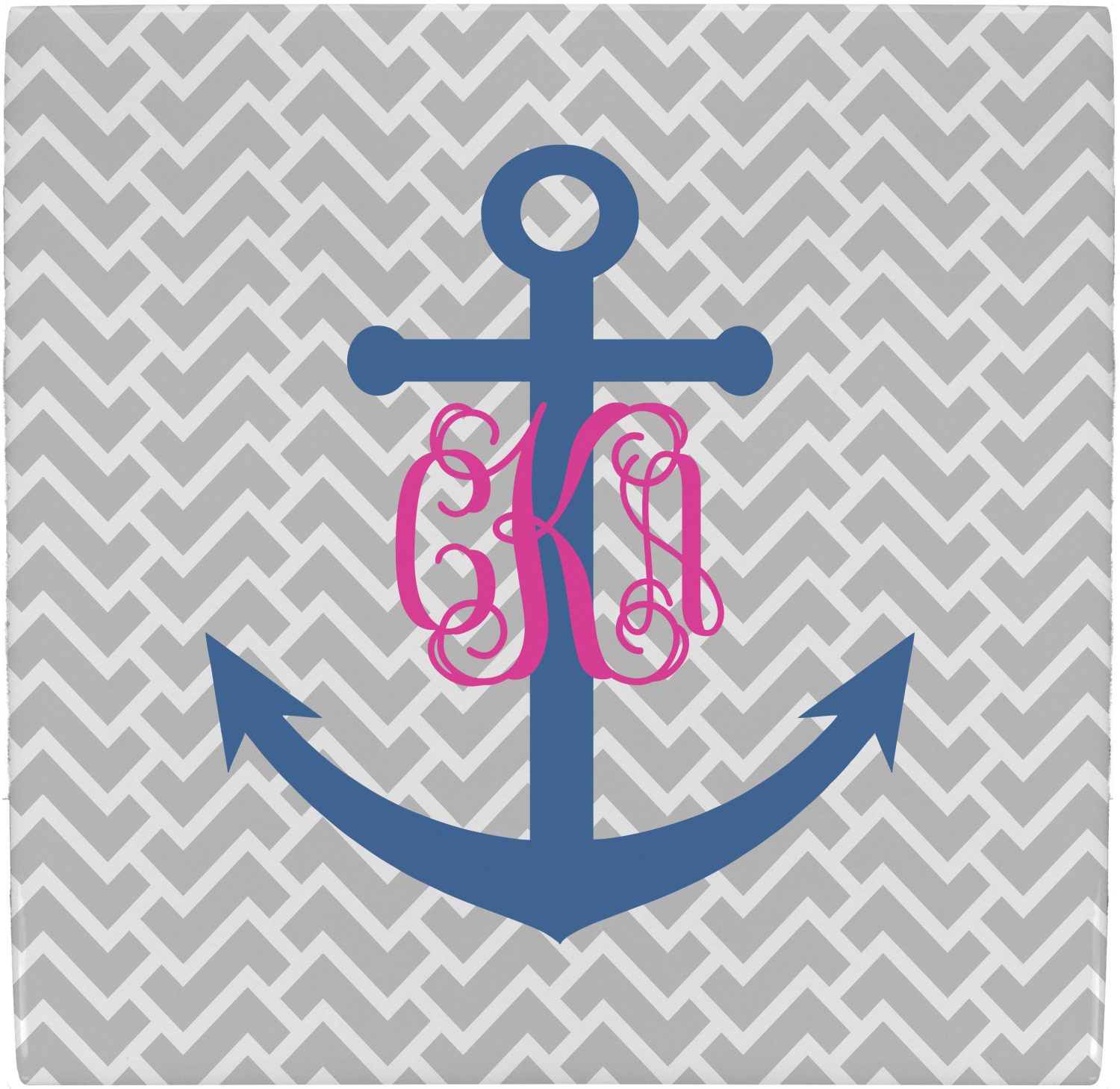 This design perfect for someone who loves anchors and monograms. In this beautiful design, we features a zigzag pattern for the background. We chose a neutral light gray color. For the foreground we chose a simple anchor in blue and we added an interlocking monogram in hot pink on top of the anchor.