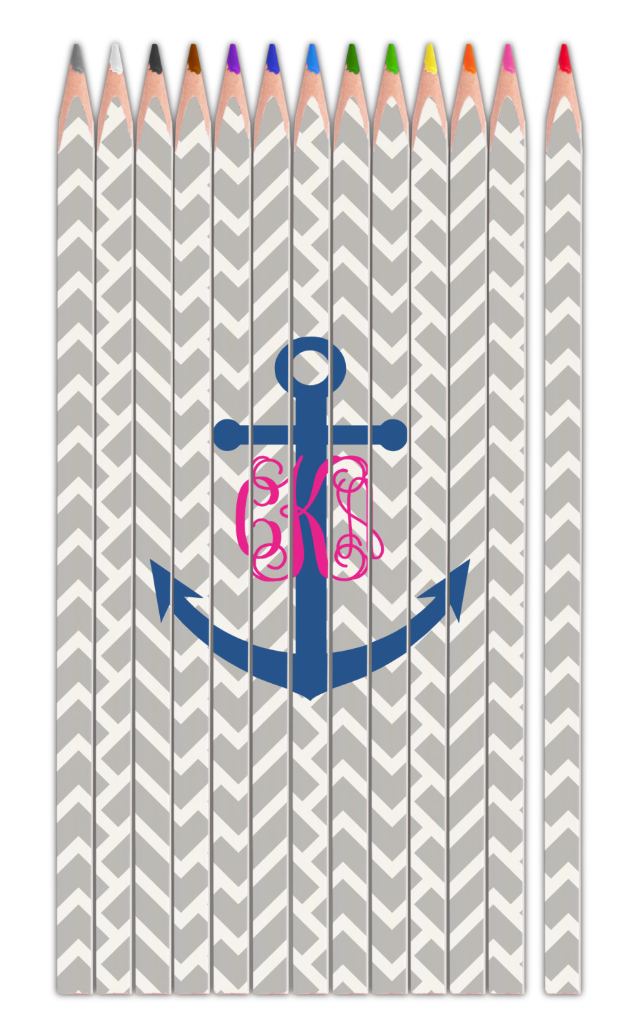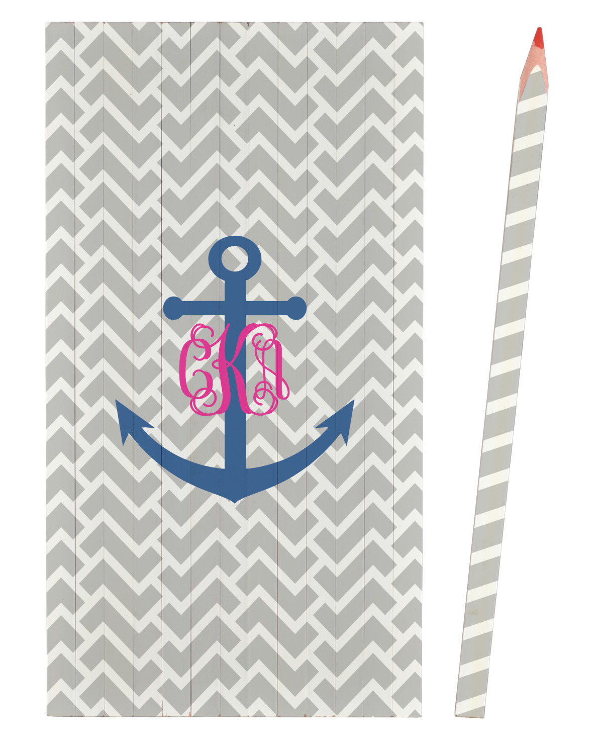 This design perfect for someone who loves anchors and monograms. In this beautiful design, we features a zigzag pattern for the background. We chose a neutral light gray color. For the foreground we chose a simple anchor in blue and we added an interlocking monogram in hot pink on top of the anchor.