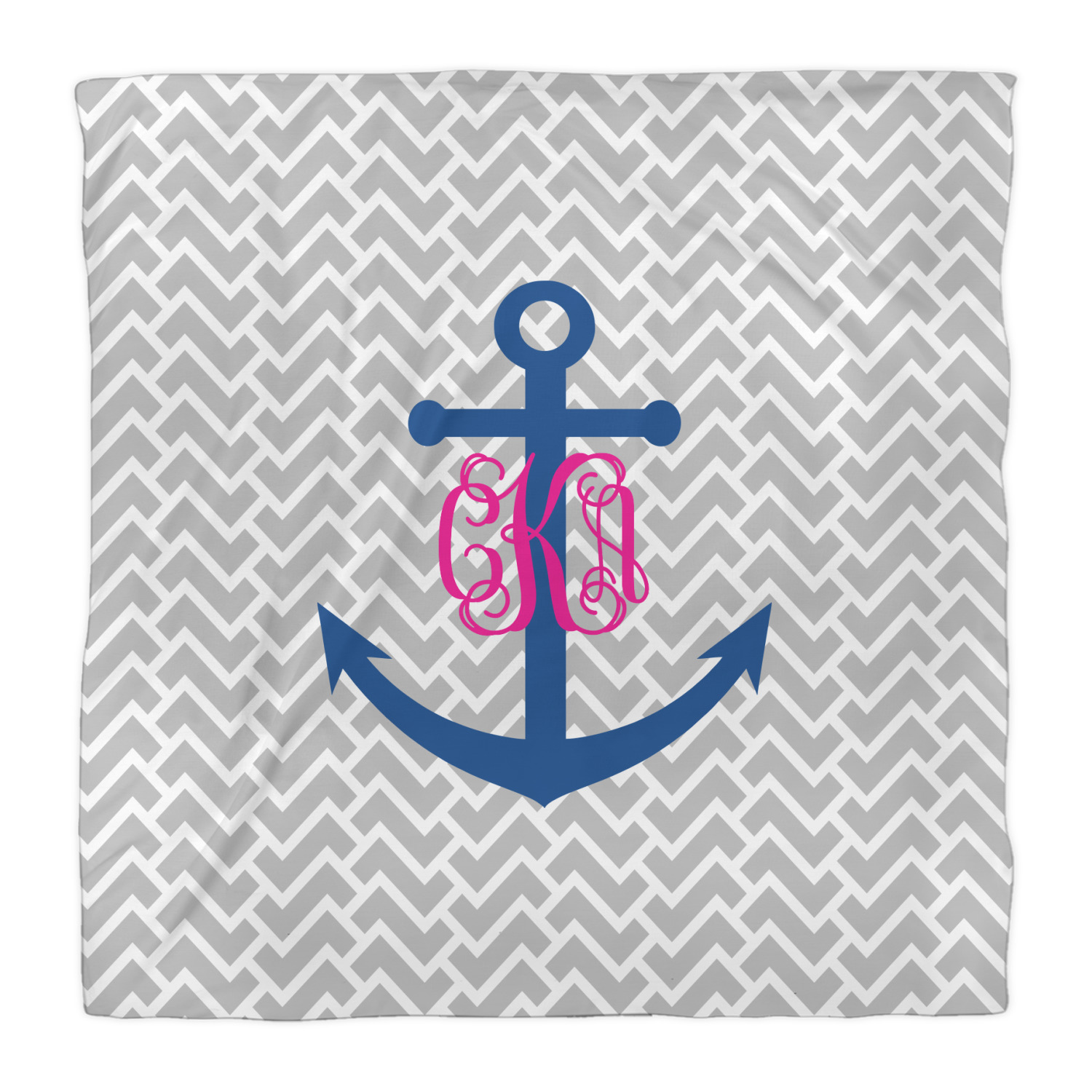 This design perfect for someone who loves anchors and monograms. In this beautiful design, we features a zigzag pattern for the background. We chose a neutral light gray color. For the foreground we chose a simple anchor in blue and we added an interlocking monogram in hot pink on top of the anchor.