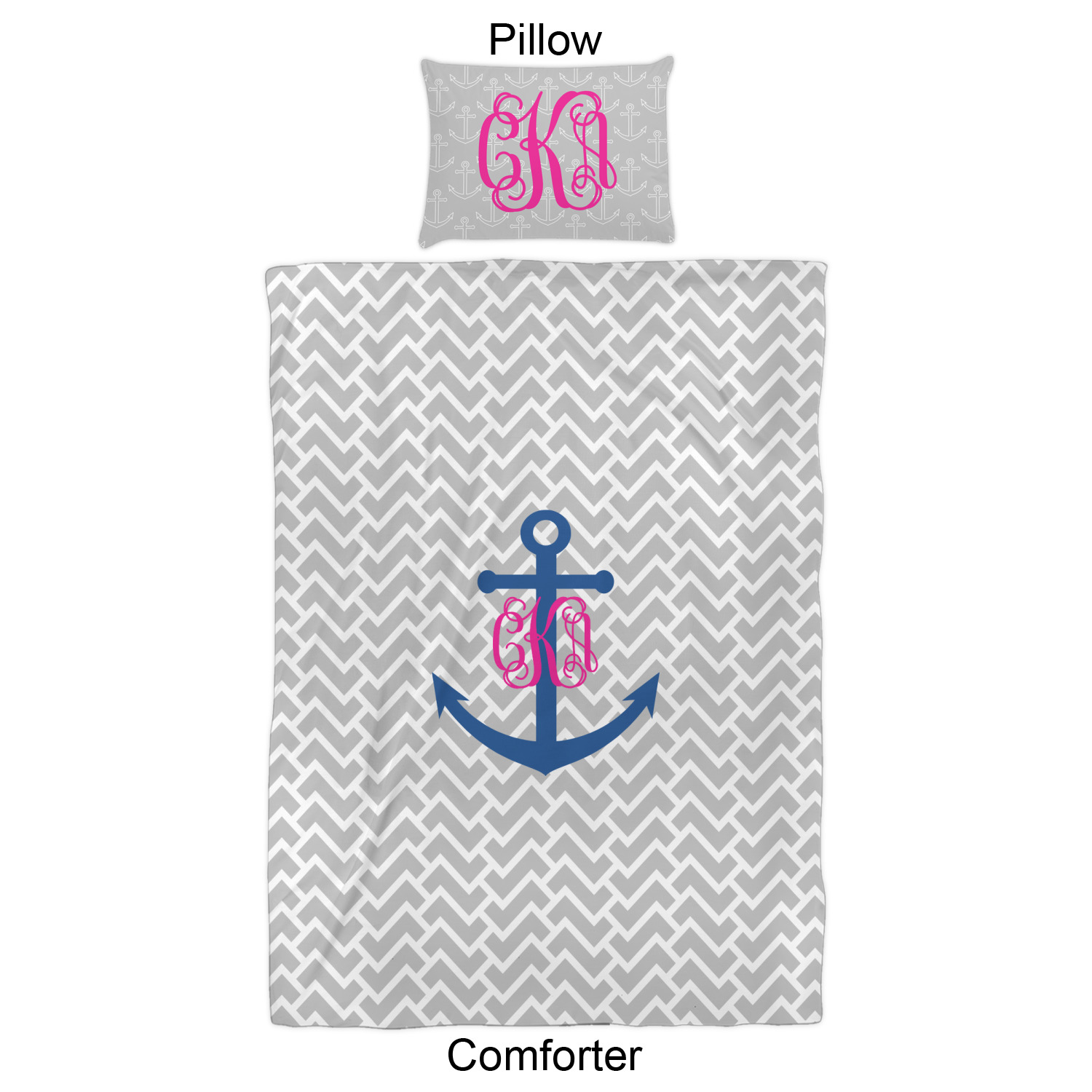 This design perfect for someone who loves anchors and monograms. In this beautiful design, we features a zigzag pattern for the background. We chose a neutral light gray color. For the foreground we chose a simple anchor in blue and we added an interlocking monogram in hot pink on top of the anchor.