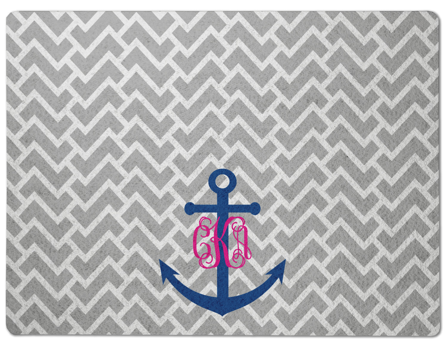 This design perfect for someone who loves anchors and monograms. In this beautiful design, we features a zigzag pattern for the background. We chose a neutral light gray color. For the foreground we chose a simple anchor in blue and we added an interlocking monogram in hot pink on top of the anchor.