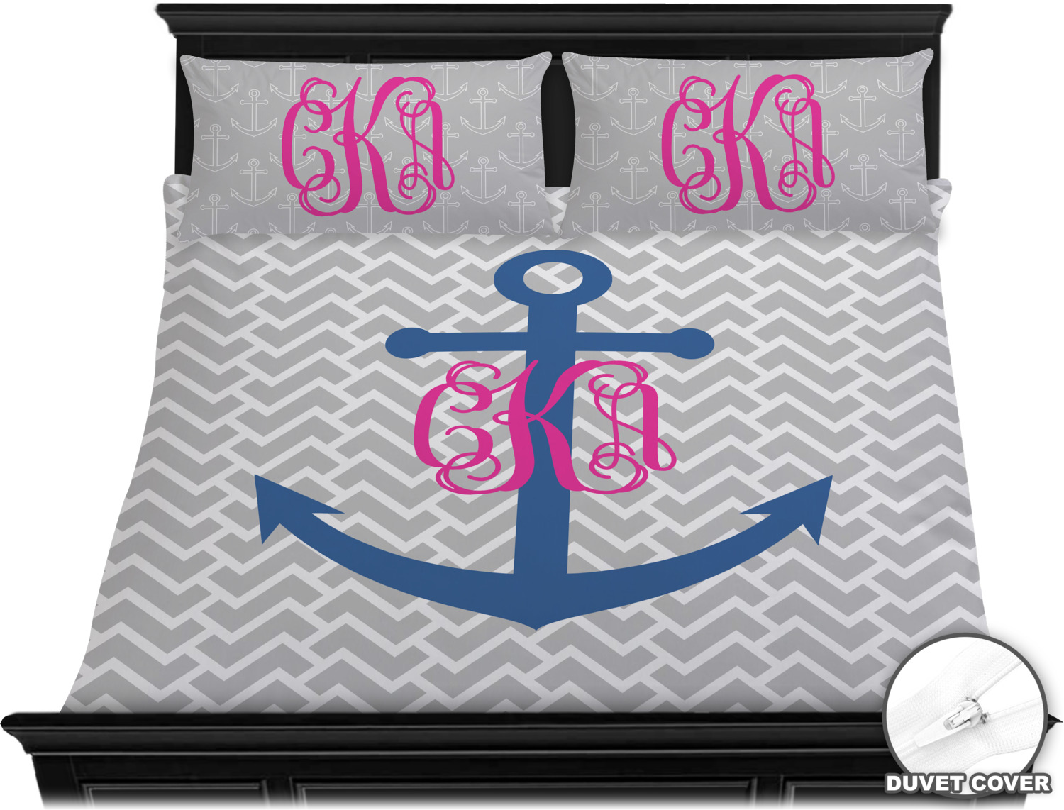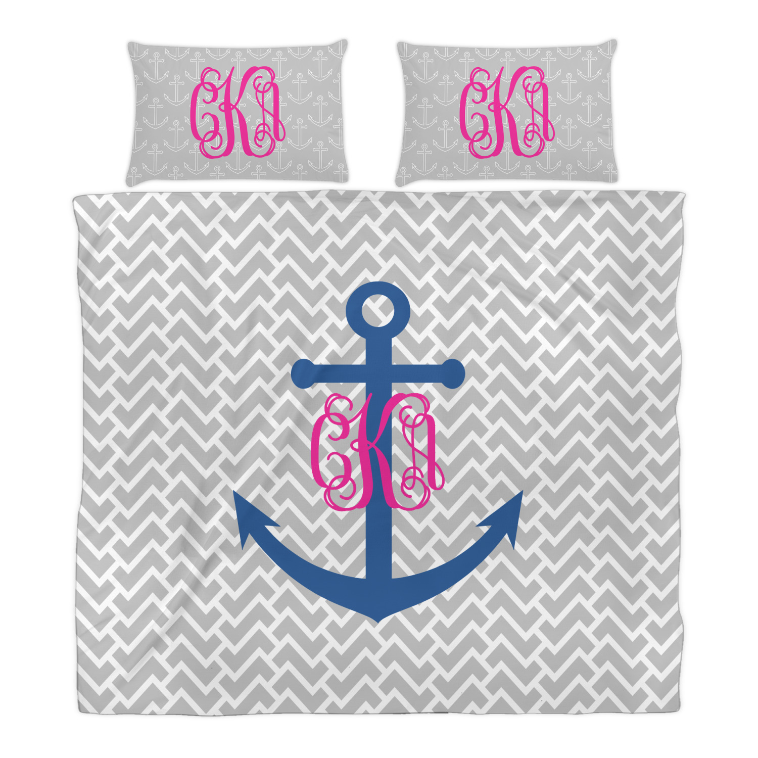 This design perfect for someone who loves anchors and monograms. In this beautiful design, we features a zigzag pattern for the background. We chose a neutral light gray color. For the foreground we chose a simple anchor in blue and we added an interlocking monogram in hot pink on top of the anchor.