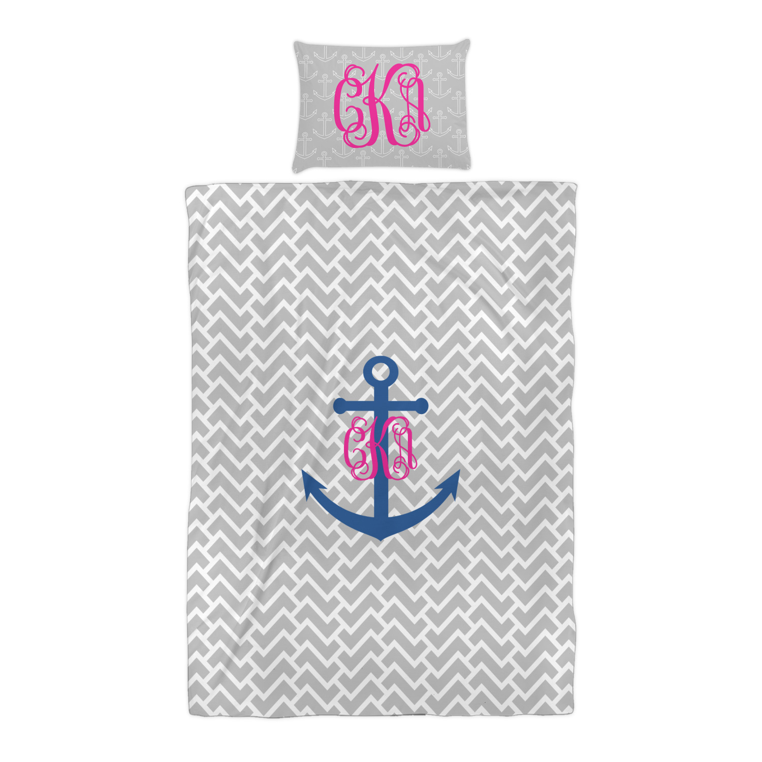 This design perfect for someone who loves anchors and monograms. In this beautiful design, we features a zigzag pattern for the background. We chose a neutral light gray color. For the foreground we chose a simple anchor in blue and we added an interlocking monogram in hot pink on top of the anchor.