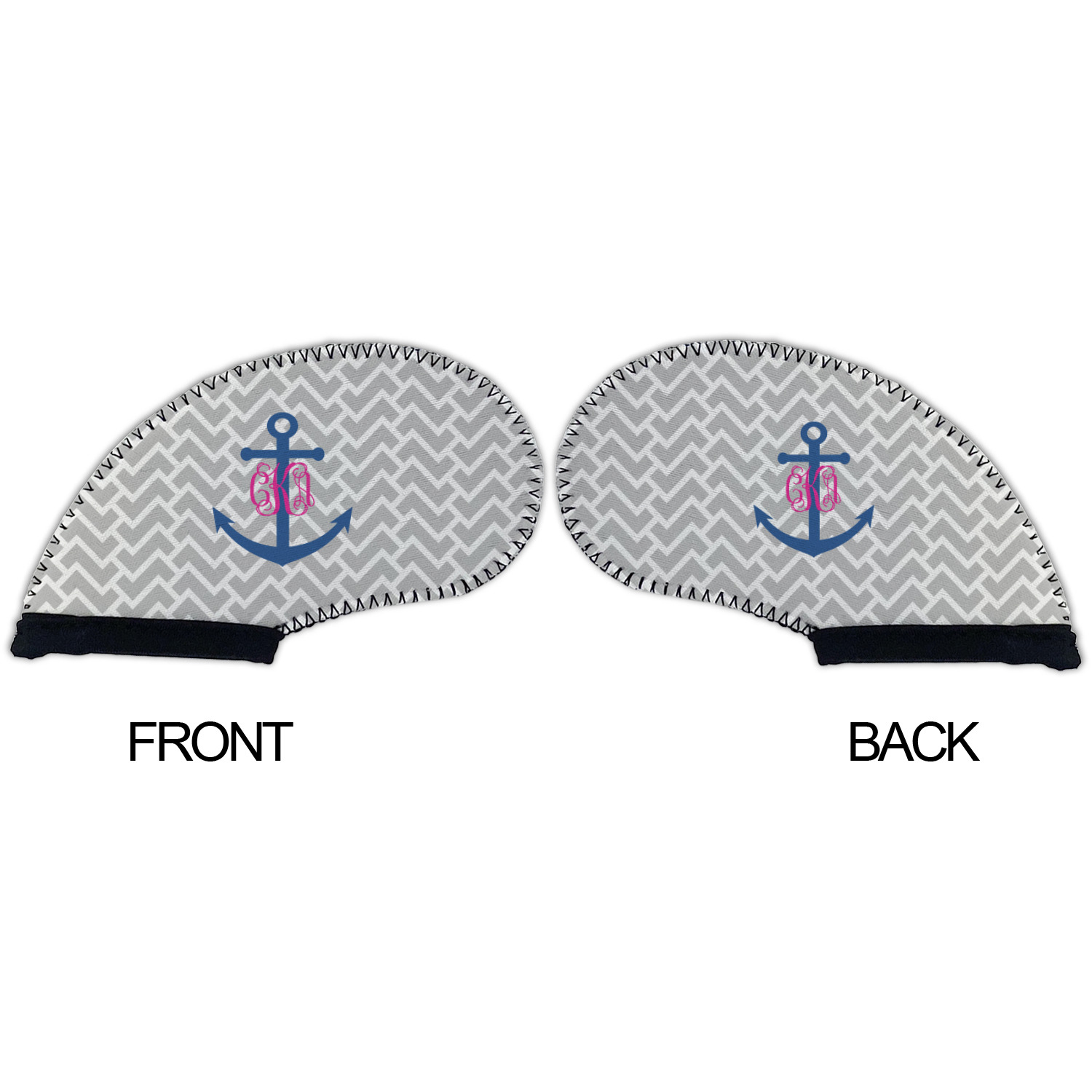 This design perfect for someone who loves anchors and monograms. In this beautiful design, we features a zigzag pattern for the background. We chose a neutral light gray color. For the foreground we chose a simple anchor in blue and we added an interlocking monogram in hot pink on top of the anchor.