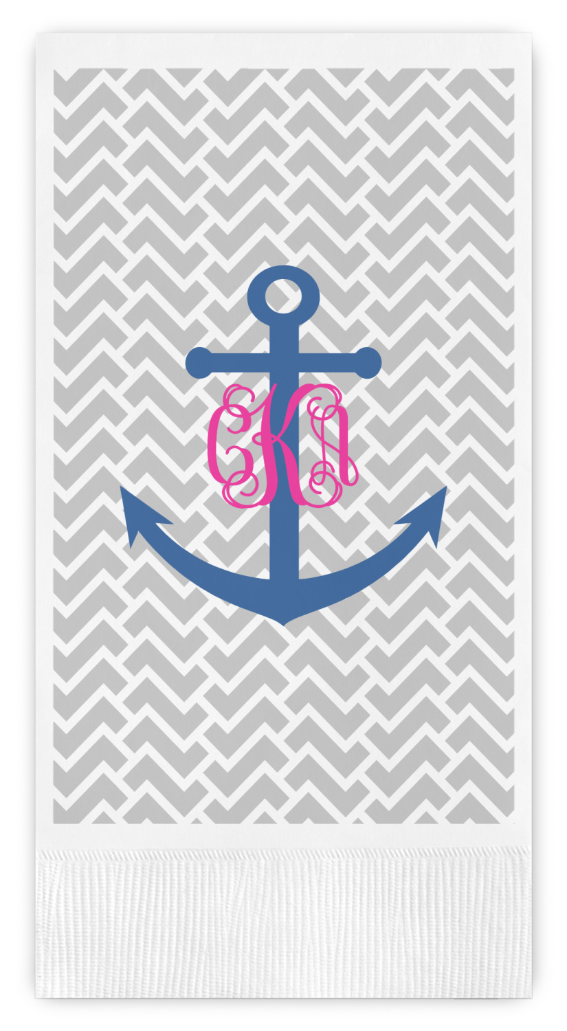 This design perfect for someone who loves anchors and monograms. In this beautiful design, we features a zigzag pattern for the background. We chose a neutral light gray color. For the foreground we chose a simple anchor in blue and we added an interlocking monogram in hot pink on top of the anchor.