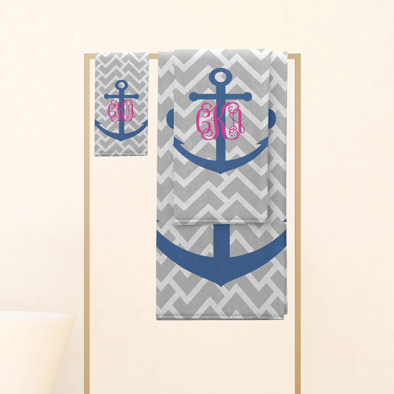 This design perfect for someone who loves anchors and monograms. In this beautiful design, we features a zigzag pattern for the background. We chose a neutral light gray color. For the foreground we chose a simple anchor in blue and we added an interlocking monogram in hot pink on top of the anchor.
