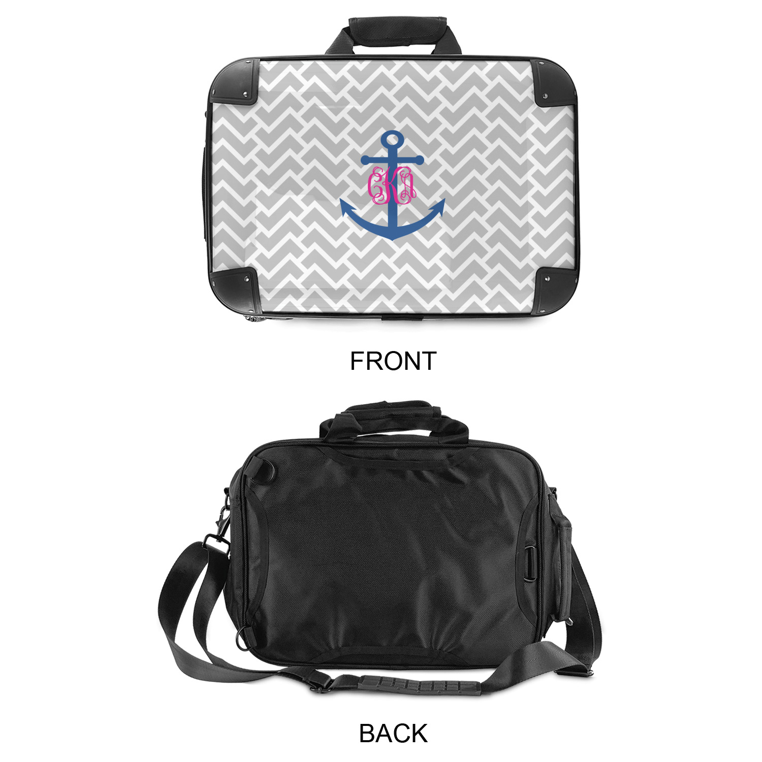 This design perfect for someone who loves anchors and monograms. In this beautiful design, we features a zigzag pattern for the background. We chose a neutral light gray color. For the foreground we chose a simple anchor in blue and we added an interlocking monogram in hot pink on top of the anchor.