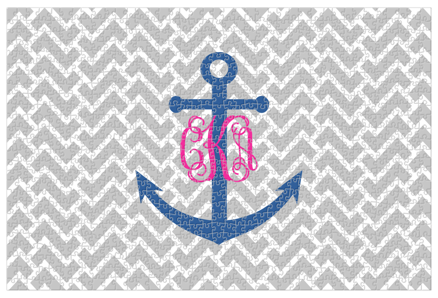 This design perfect for someone who loves anchors and monograms. In this beautiful design, we features a zigzag pattern for the background. We chose a neutral light gray color. For the foreground we chose a simple anchor in blue and we added an interlocking monogram in hot pink on top of the anchor.