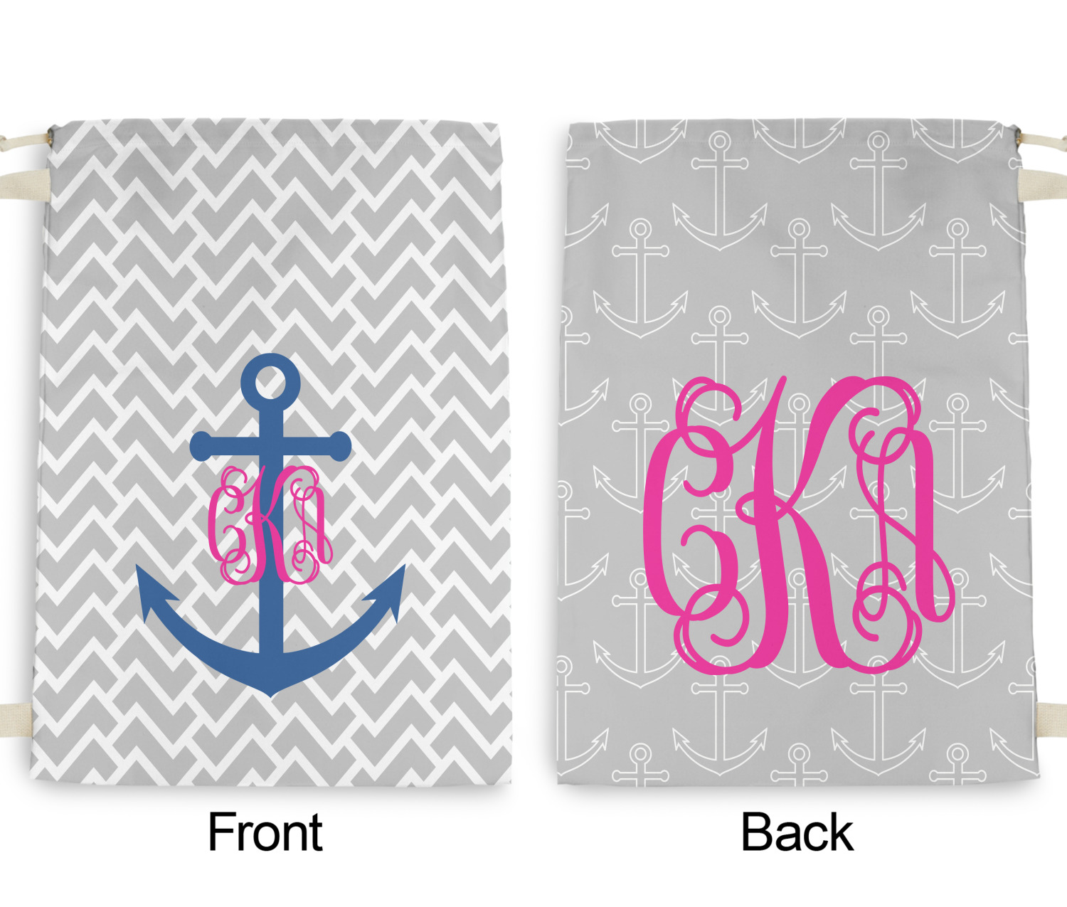 This design perfect for someone who loves anchors and monograms. In this beautiful design, we features a zigzag pattern for the background. We chose a neutral light gray color. For the foreground we chose a simple anchor in blue and we added an interlocking monogram in hot pink on top of the anchor.