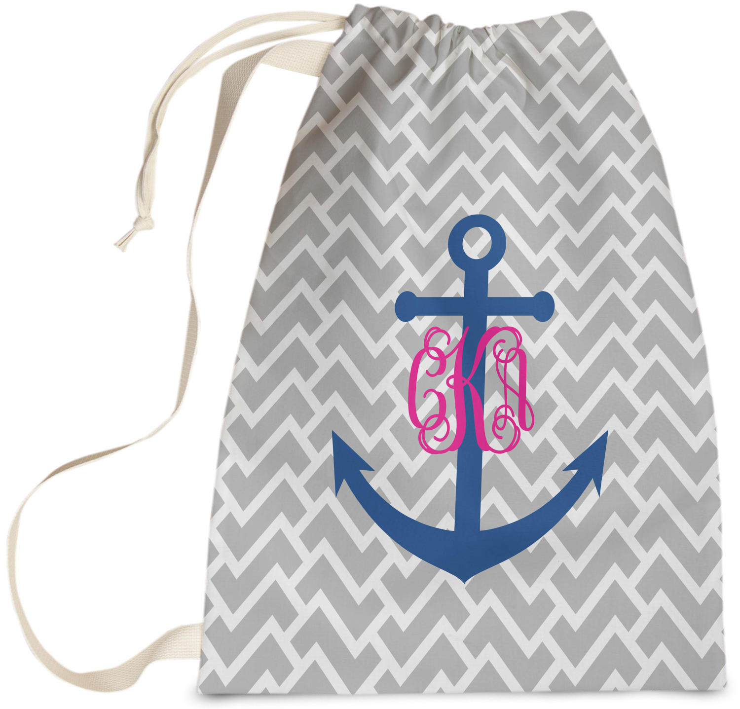 This design perfect for someone who loves anchors and monograms. In this beautiful design, we features a zigzag pattern for the background. We chose a neutral light gray color. For the foreground we chose a simple anchor in blue and we added an interlocking monogram in hot pink on top of the anchor.