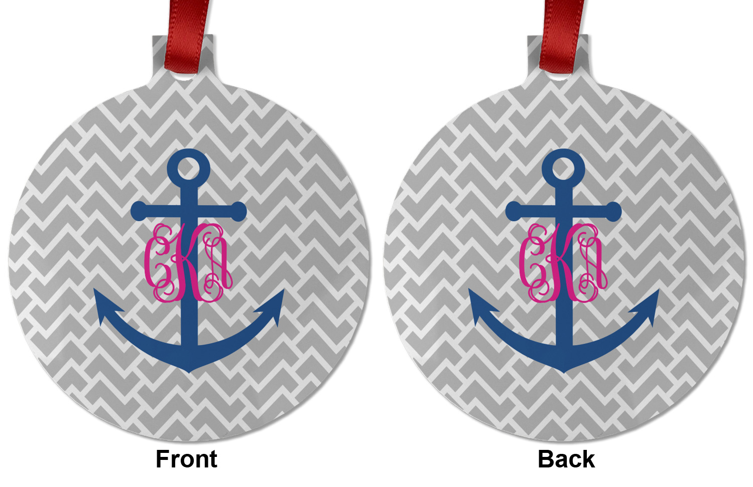 This design perfect for someone who loves anchors and monograms. In this beautiful design, we features a zigzag pattern for the background. We chose a neutral light gray color. For the foreground we chose a simple anchor in blue and we added an interlocking monogram in hot pink on top of the anchor.