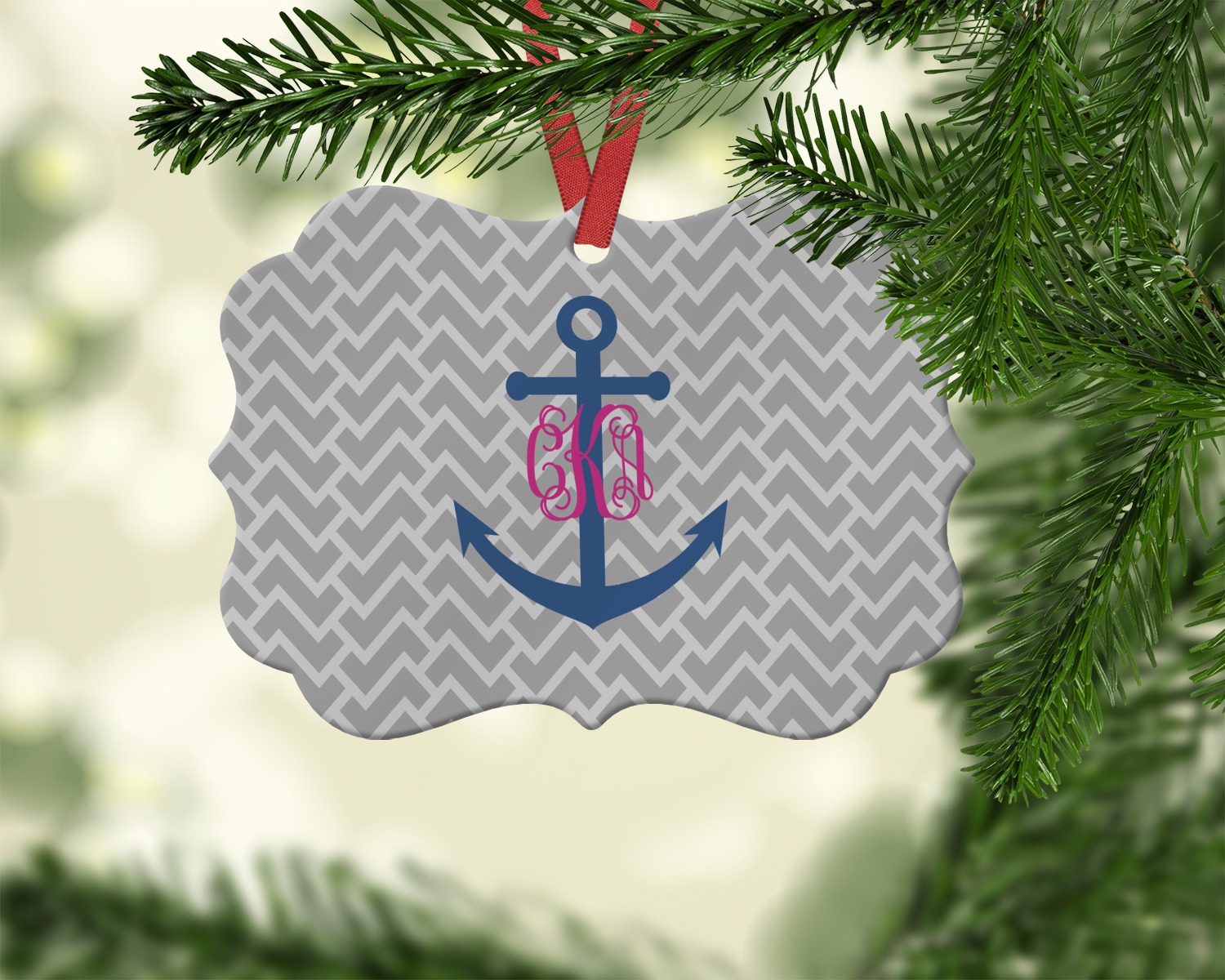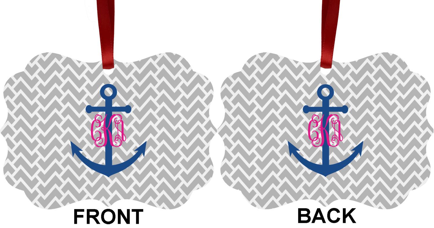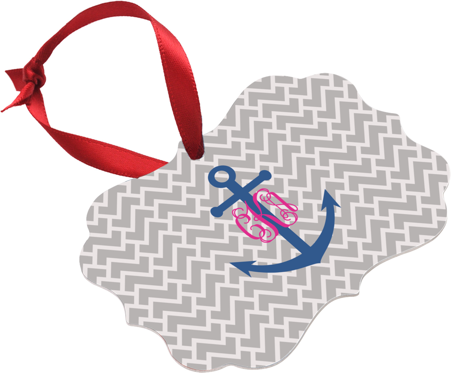 This design perfect for someone who loves anchors and monograms. In this beautiful design, we features a zigzag pattern for the background. We chose a neutral light gray color. For the foreground we chose a simple anchor in blue and we added an interlocking monogram in hot pink on top of the anchor.