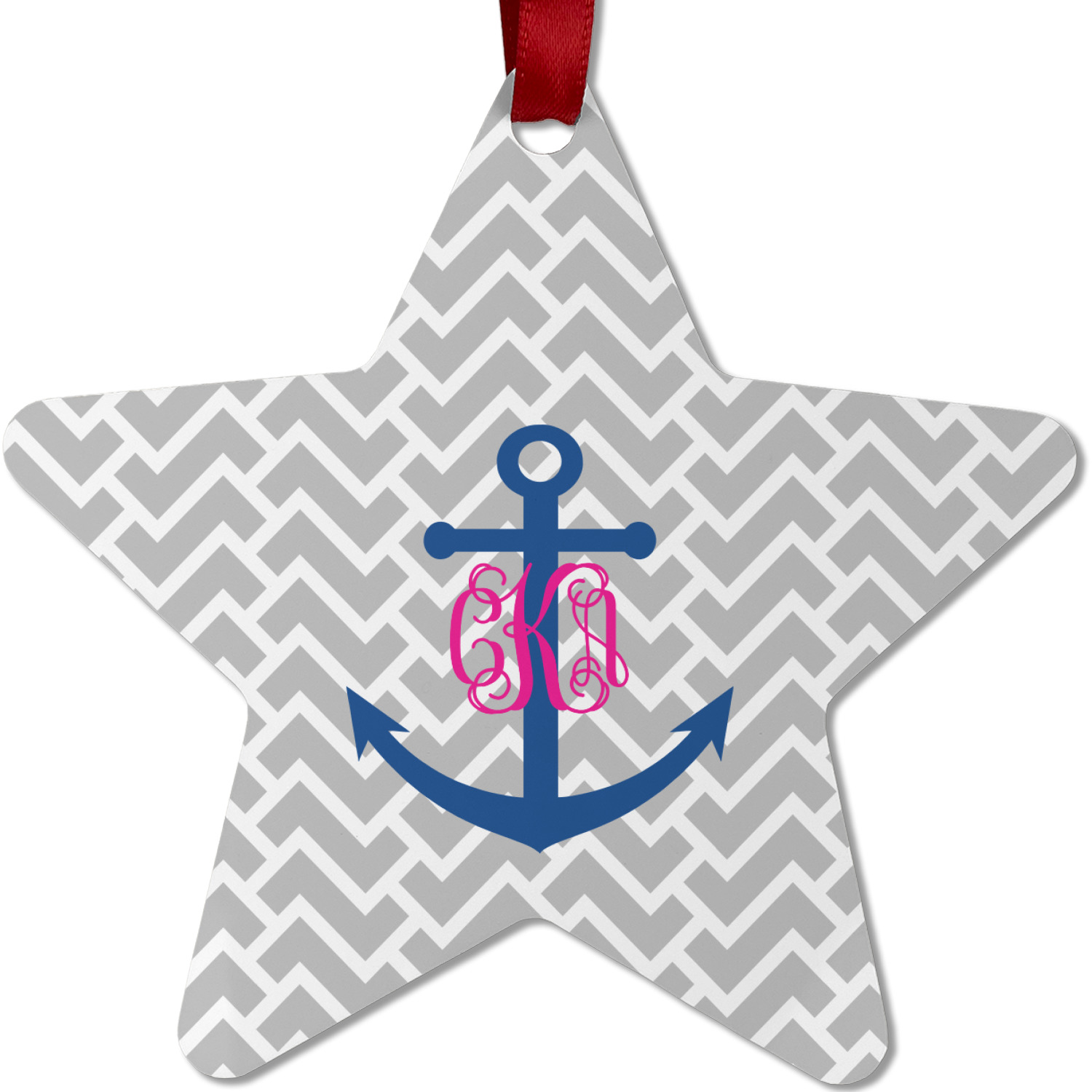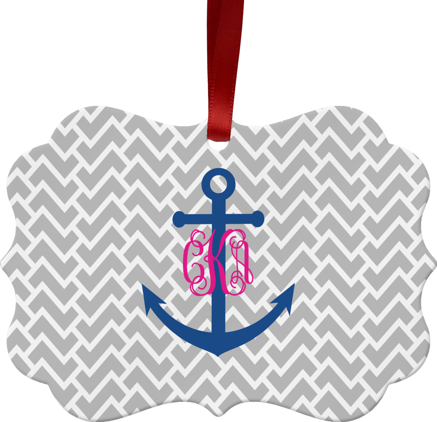 This design perfect for someone who loves anchors and monograms. In this beautiful design, we features a zigzag pattern for the background. We chose a neutral light gray color. For the foreground we chose a simple anchor in blue and we added an interlocking monogram in hot pink on top of the anchor.