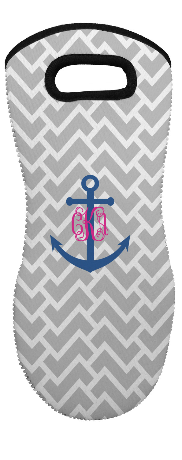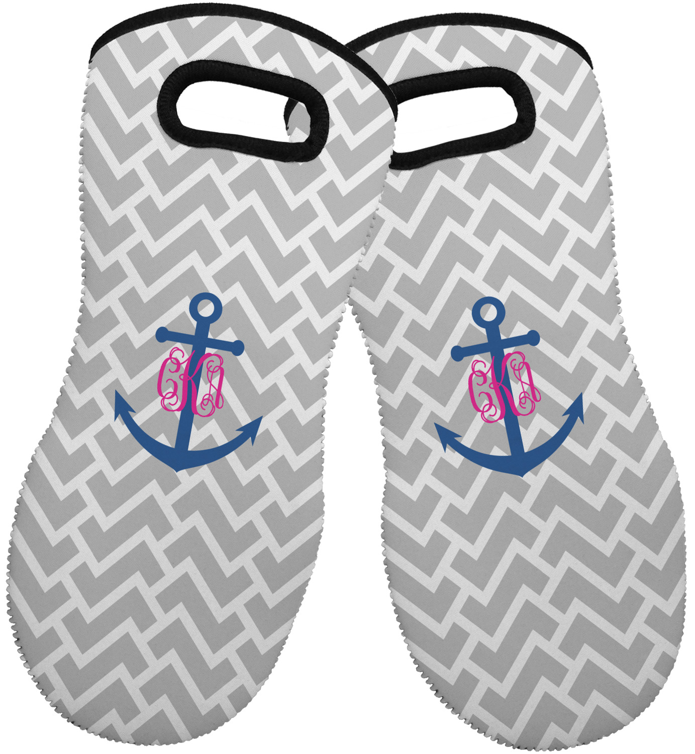 This design perfect for someone who loves anchors and monograms. In this beautiful design, we features a zigzag pattern for the background. We chose a neutral light gray color. For the foreground we chose a simple anchor in blue and we added an interlocking monogram in hot pink on top of the anchor.