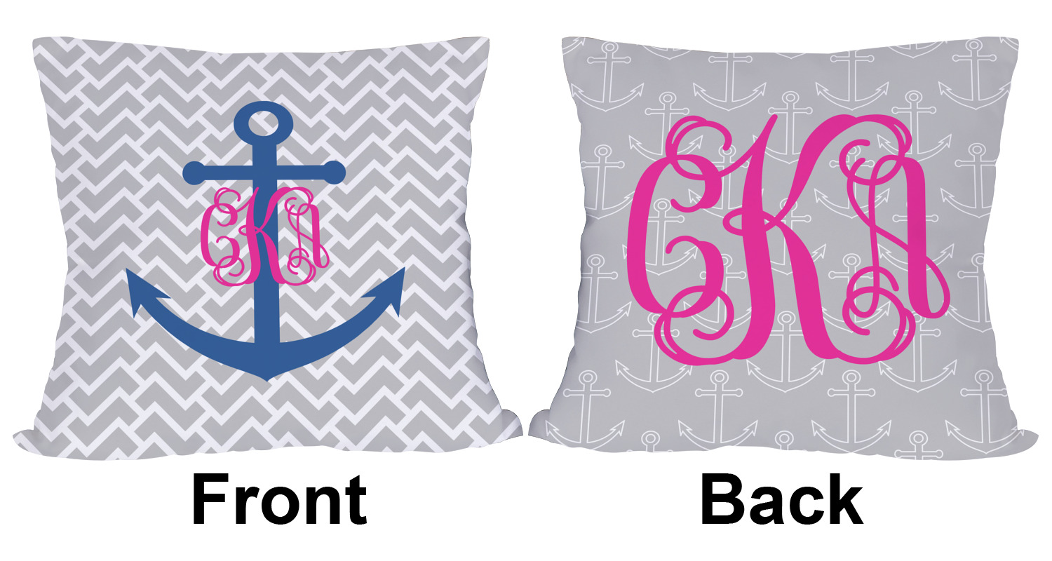 This design perfect for someone who loves anchors and monograms. In this beautiful design, we features a zigzag pattern for the background. We chose a neutral light gray color. For the foreground we chose a simple anchor in blue and we added an interlocking monogram in hot pink on top of the anchor.