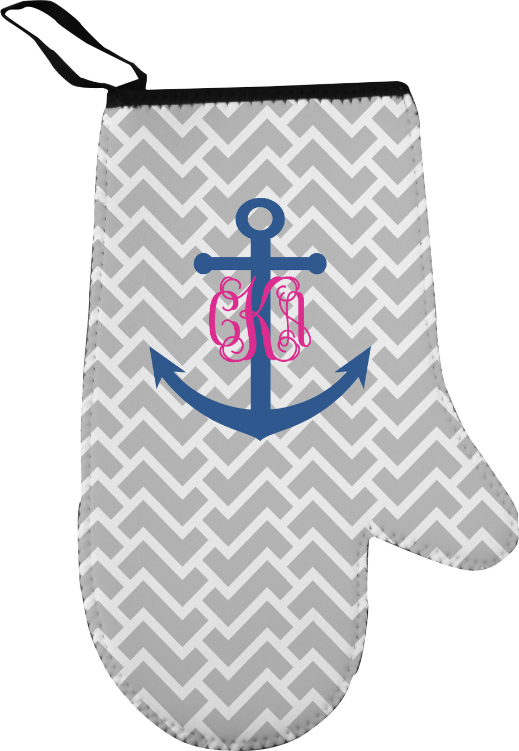 This design perfect for someone who loves anchors and monograms. In this beautiful design, we features a zigzag pattern for the background. We chose a neutral light gray color. For the foreground we chose a simple anchor in blue and we added an interlocking monogram in hot pink on top of the anchor.