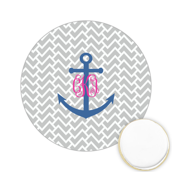 This design perfect for someone who loves anchors and monograms. In this beautiful design, we features a zigzag pattern for the background. We chose a neutral light gray color. For the foreground we chose a simple anchor in blue and we added an interlocking monogram in hot pink on top of the anchor.