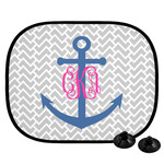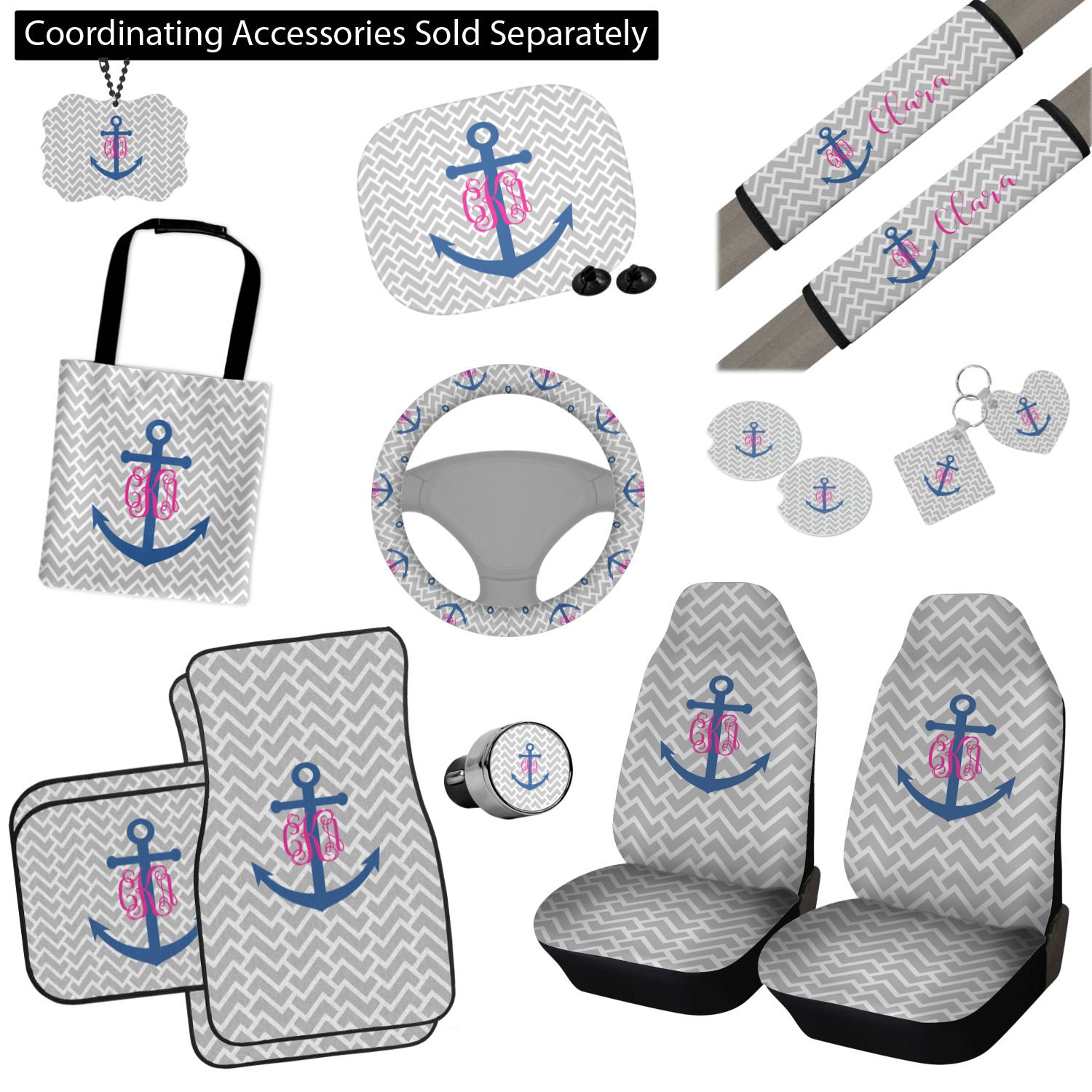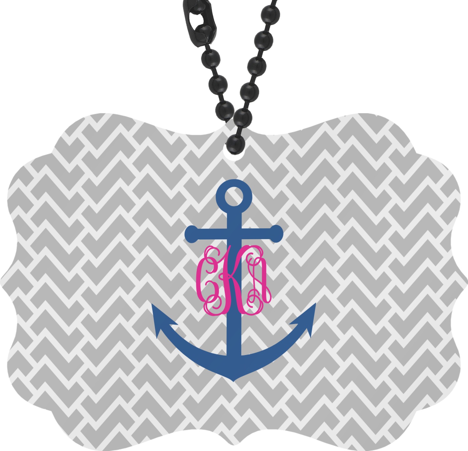 This design perfect for someone who loves anchors and monograms. In this beautiful design, we features a zigzag pattern for the background. We chose a neutral light gray color. For the foreground we chose a simple anchor in blue and we added an interlocking monogram in hot pink on top of the anchor.