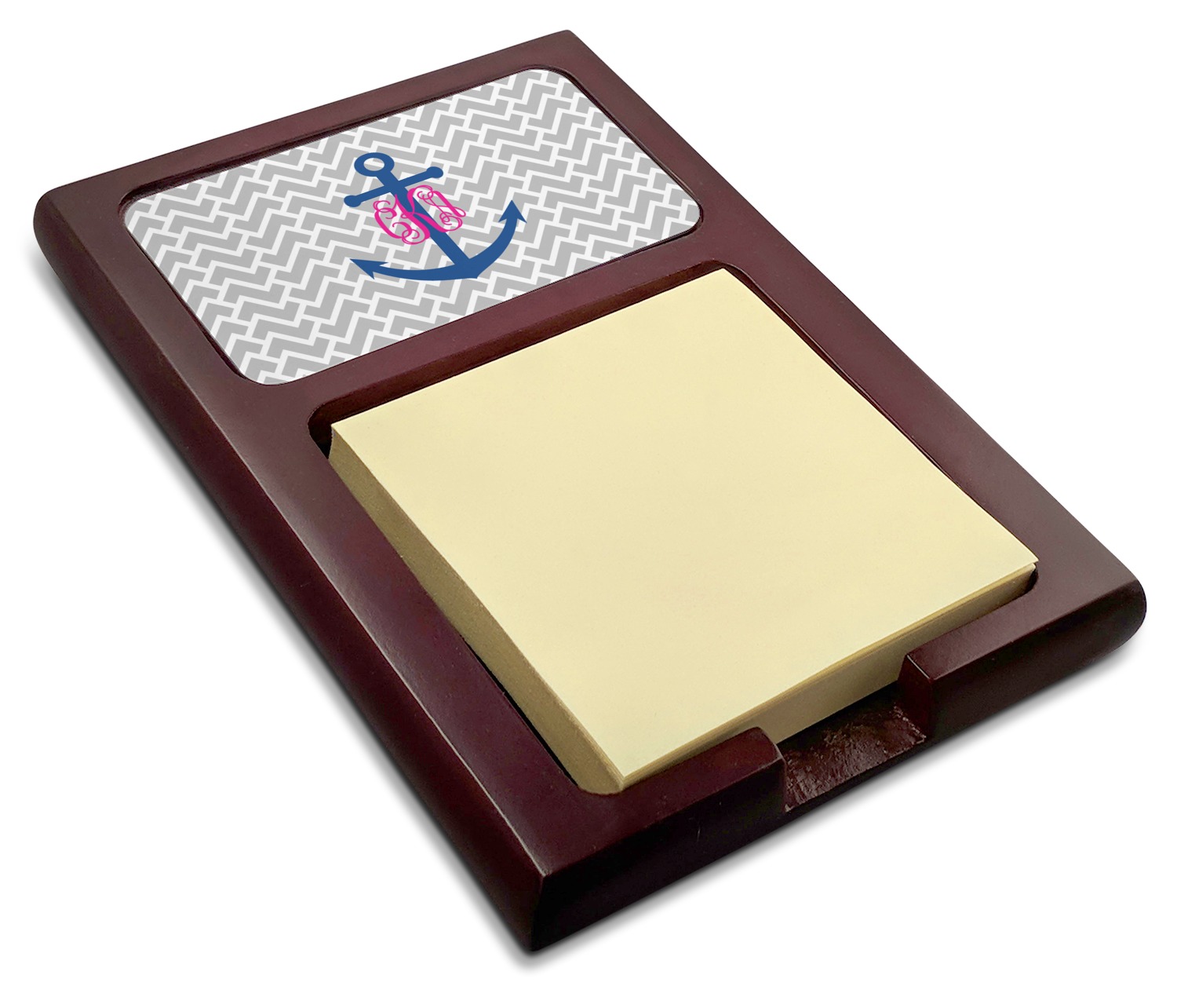 Crafted from a fine mahogany, this post it note holder is in the shade of a dark, cherry color. The dispenser itself is about 4.25 by 6.25 by 0.75 inches. You can place your 3 by 3 inch sticky notes in the indentation below the nameplate. We print your customization onto the nameplate that rests above the velvety indentation.