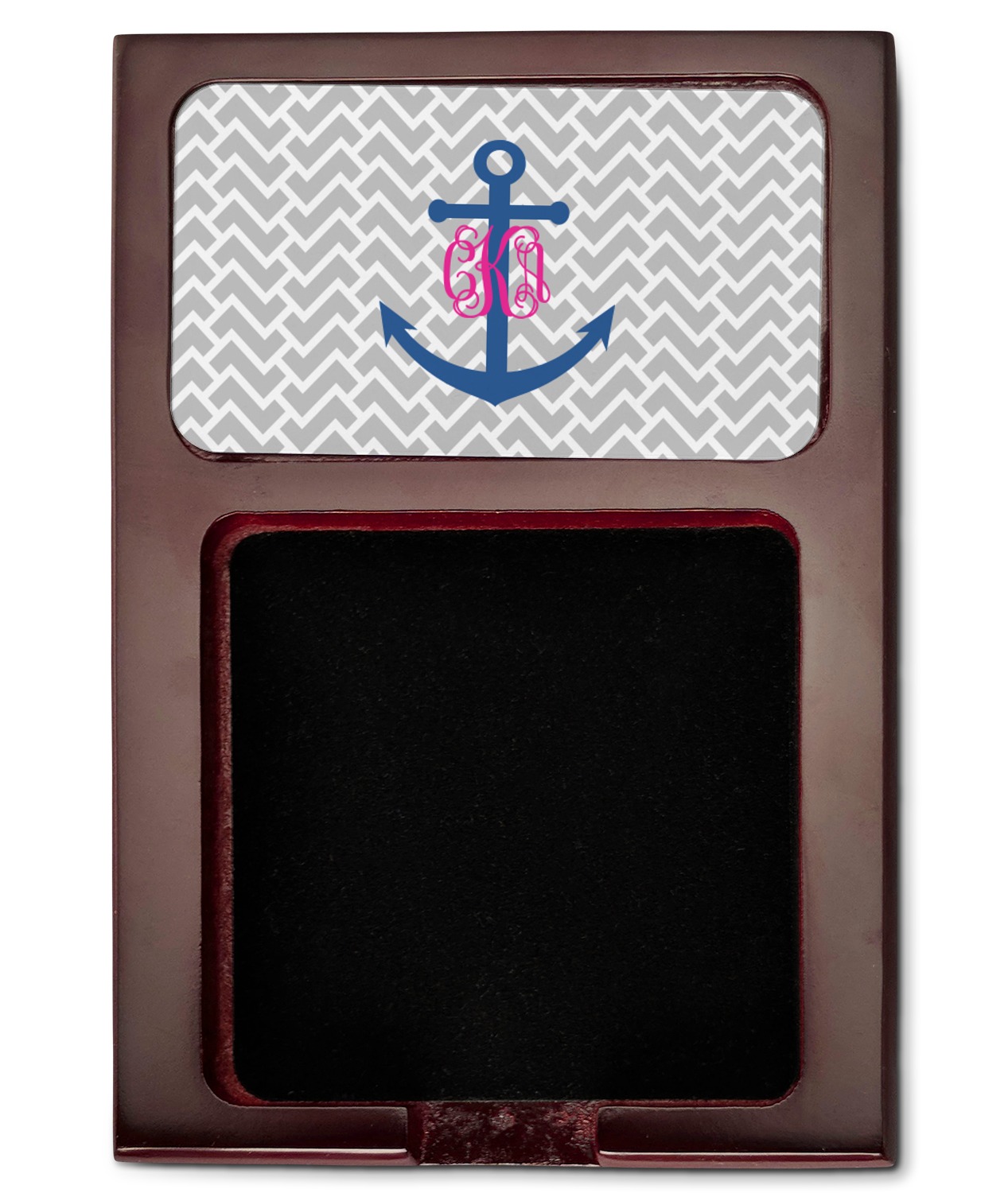 This design perfect for someone who loves anchors and monograms. In this beautiful design, we features a zigzag pattern for the background. We chose a neutral light gray color. For the foreground we chose a simple anchor in blue and we added an interlocking monogram in hot pink on top of the anchor.