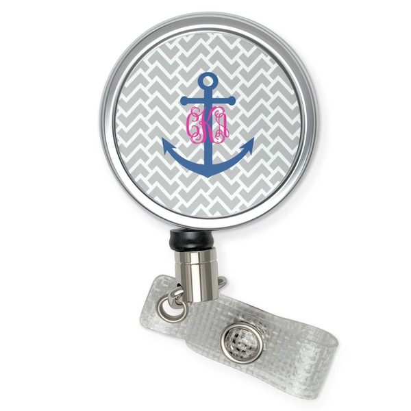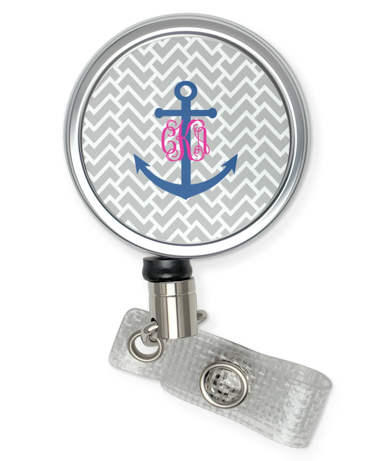 This design perfect for someone who loves anchors and monograms. In this beautiful design, we features a zigzag pattern for the background. We chose a neutral light gray color. For the foreground we chose a simple anchor in blue and we added an interlocking monogram in hot pink on top of the anchor.