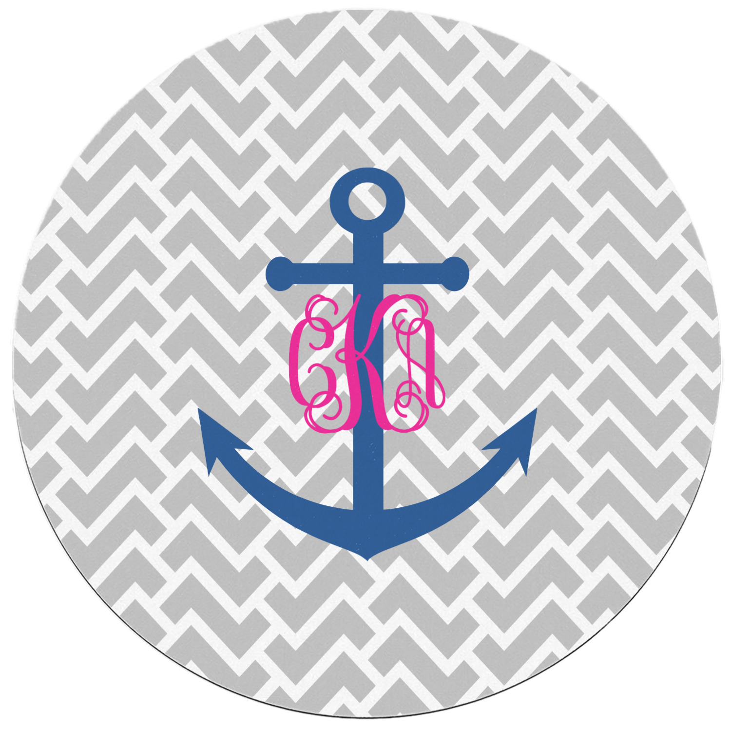 This design perfect for someone who loves anchors and monograms. In this beautiful design, we features a zigzag pattern for the background. We chose a neutral light gray color. For the foreground we chose a simple anchor in blue and we added an interlocking monogram in hot pink on top of the anchor.