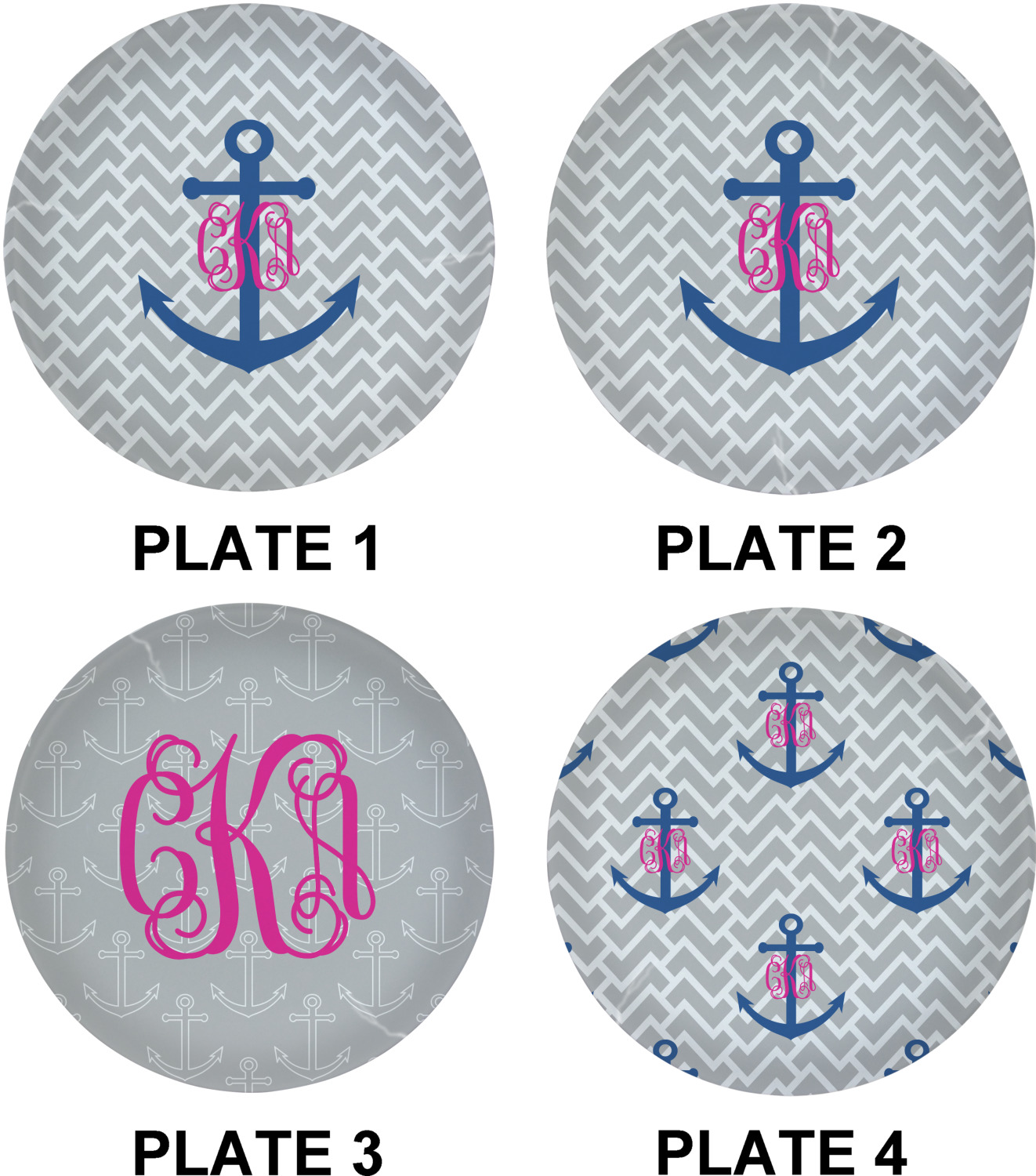 This design perfect for someone who loves anchors and monograms. In this beautiful design, we features a zigzag pattern for the background. We chose a neutral light gray color. For the foreground we chose a simple anchor in blue and we added an interlocking monogram in hot pink on top of the anchor.