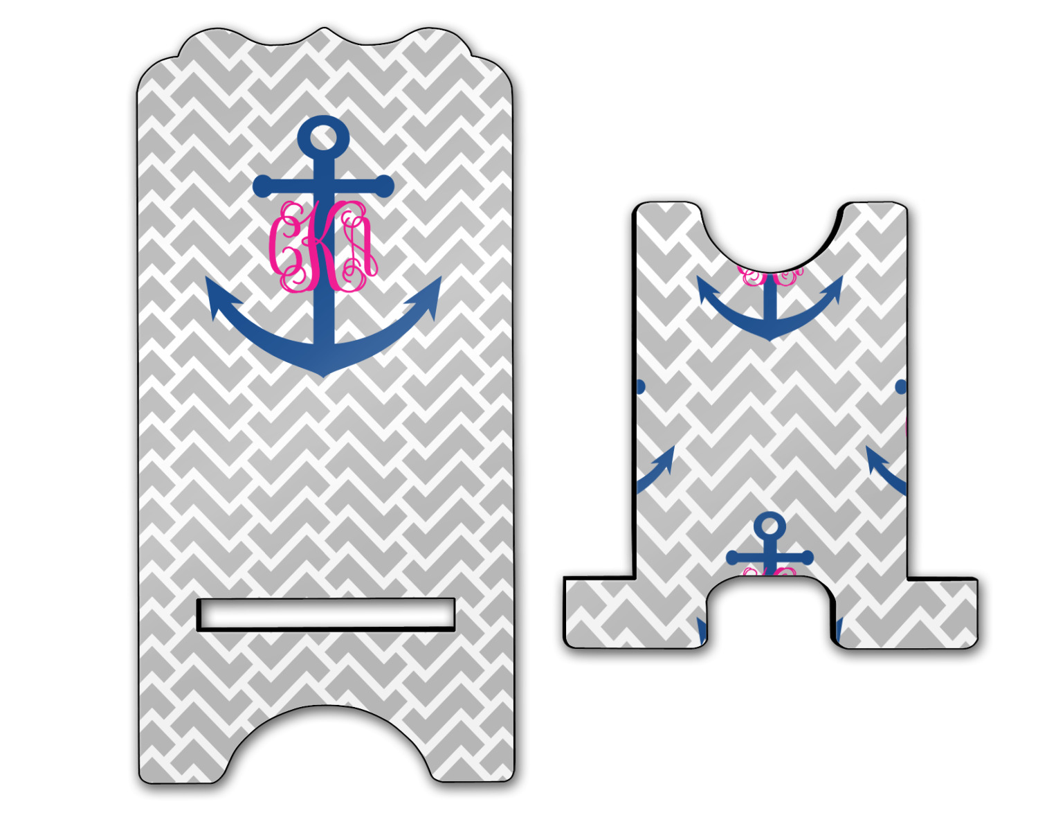 This design perfect for someone who loves anchors and monograms. In this beautiful design, we features a zigzag pattern for the background. We chose a neutral light gray color. For the foreground we chose a simple anchor in blue and we added an interlocking monogram in hot pink on top of the anchor.