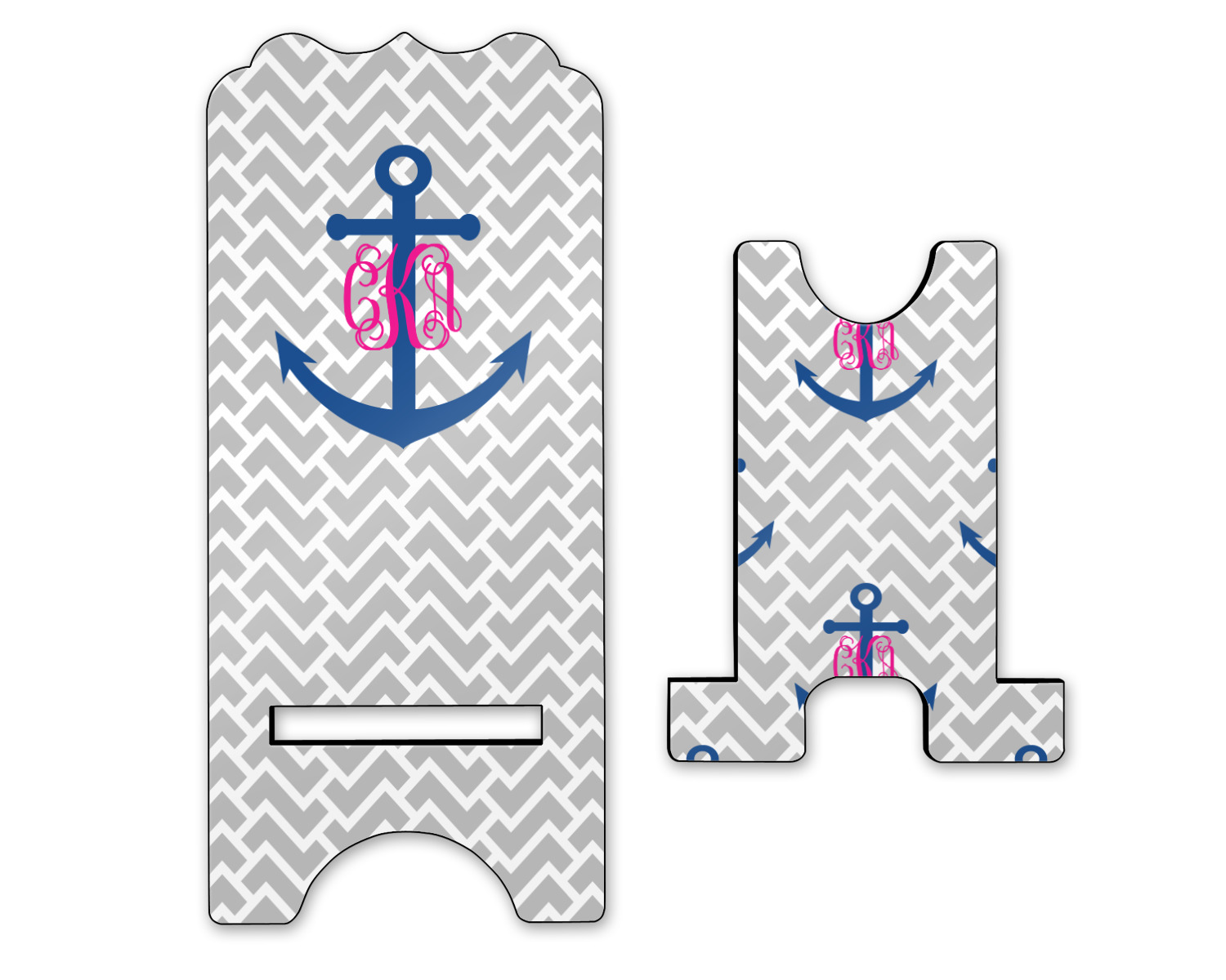 This design perfect for someone who loves anchors and monograms. In this beautiful design, we features a zigzag pattern for the background. We chose a neutral light gray color. For the foreground we chose a simple anchor in blue and we added an interlocking monogram in hot pink on top of the anchor.