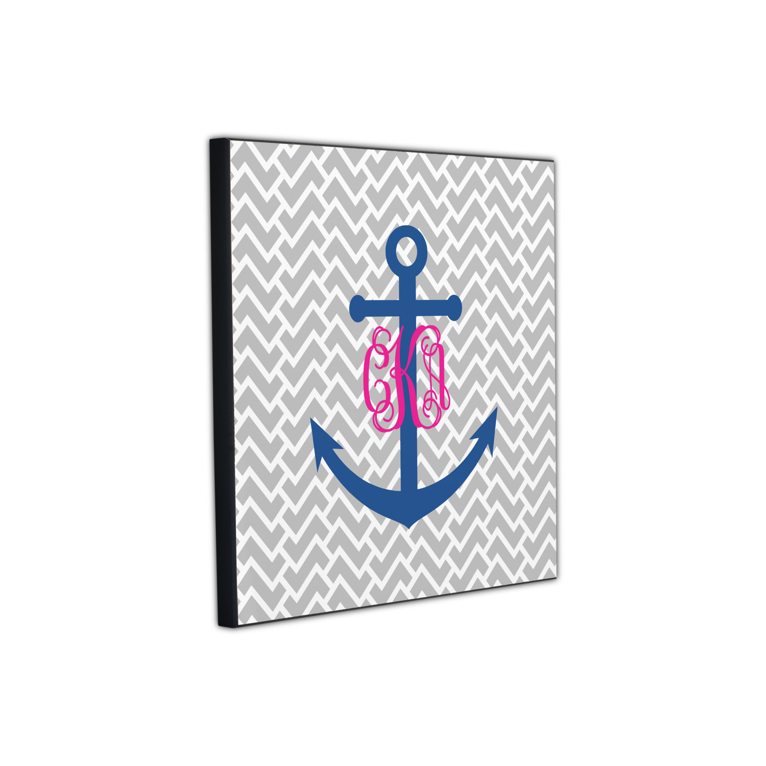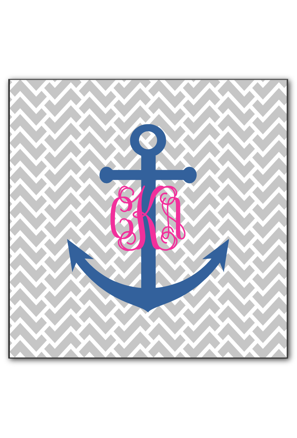 This design perfect for someone who loves anchors and monograms. In this beautiful design, we features a zigzag pattern for the background. We chose a neutral light gray color. For the foreground we chose a simple anchor in blue and we added an interlocking monogram in hot pink on top of the anchor.