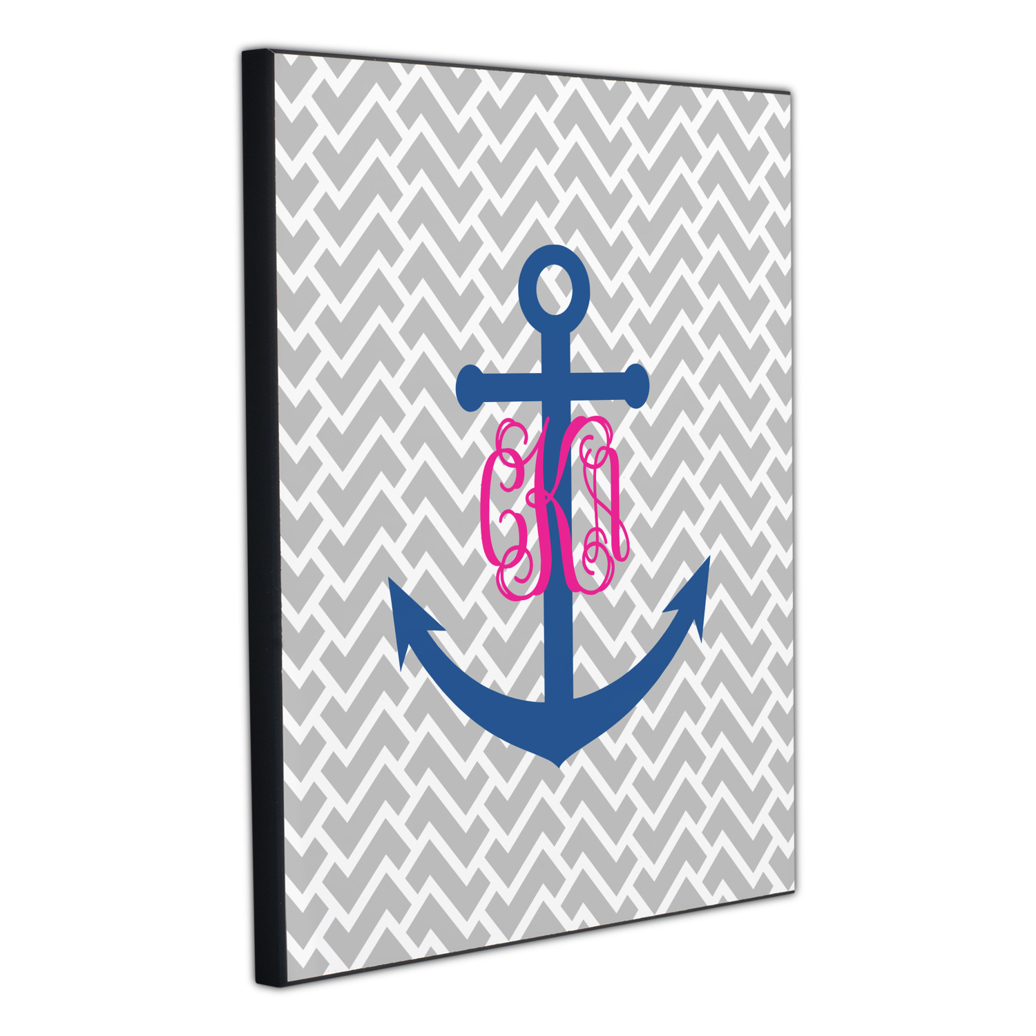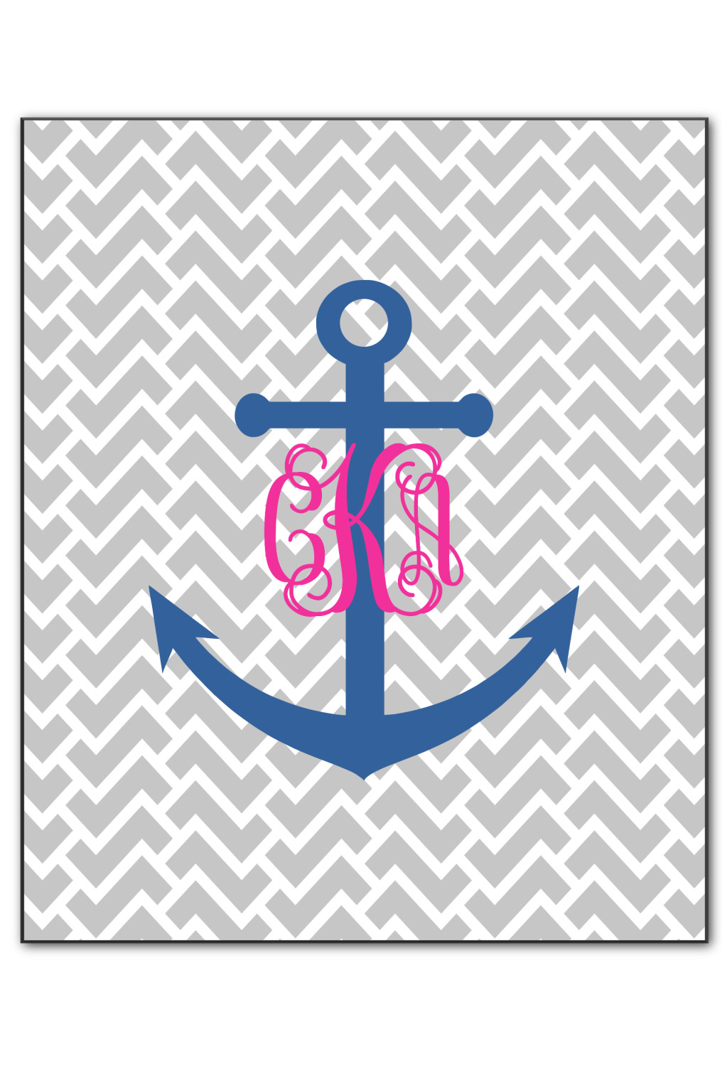 This design perfect for someone who loves anchors and monograms. In this beautiful design, we features a zigzag pattern for the background. We chose a neutral light gray color. For the foreground we chose a simple anchor in blue and we added an interlocking monogram in hot pink on top of the anchor.
