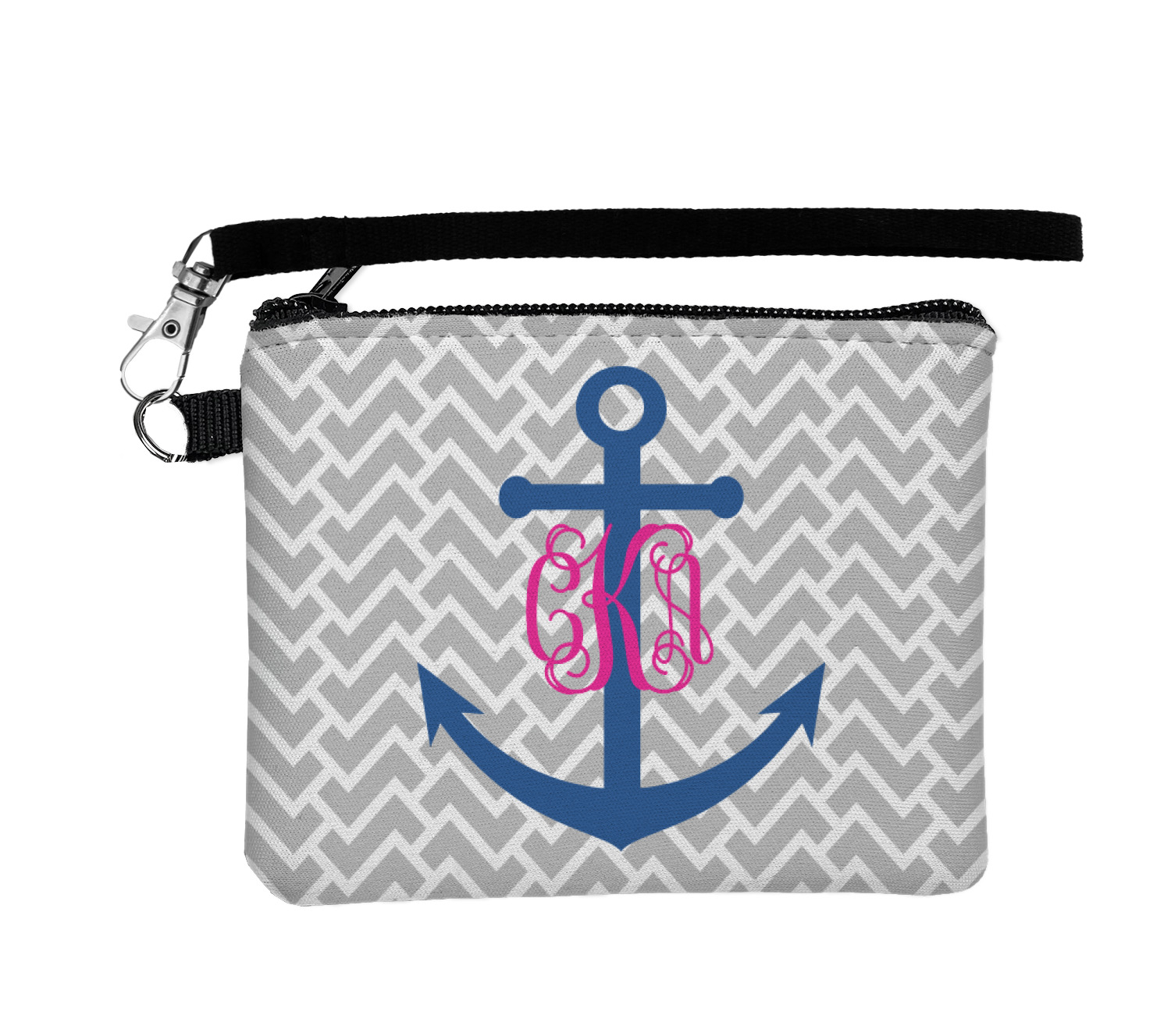 This design perfect for someone who loves anchors and monograms. In this beautiful design, we features a zigzag pattern for the background. We chose a neutral light gray color. For the foreground we chose a simple anchor in blue and we added an interlocking monogram in hot pink on top of the anchor.