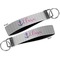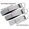 These key fob keychains are made from a polyester weave, right here in the USA. They feature a silver, metal clasp, attached to a round keyring. The piece gives the personalized wristlet a beautiful, finished look. Your customized design is printed on the outside of the keychain strap. We carry these wristlets in two sizes: small, which is 5 inches in width, and large, which is 5.5 inches in width.