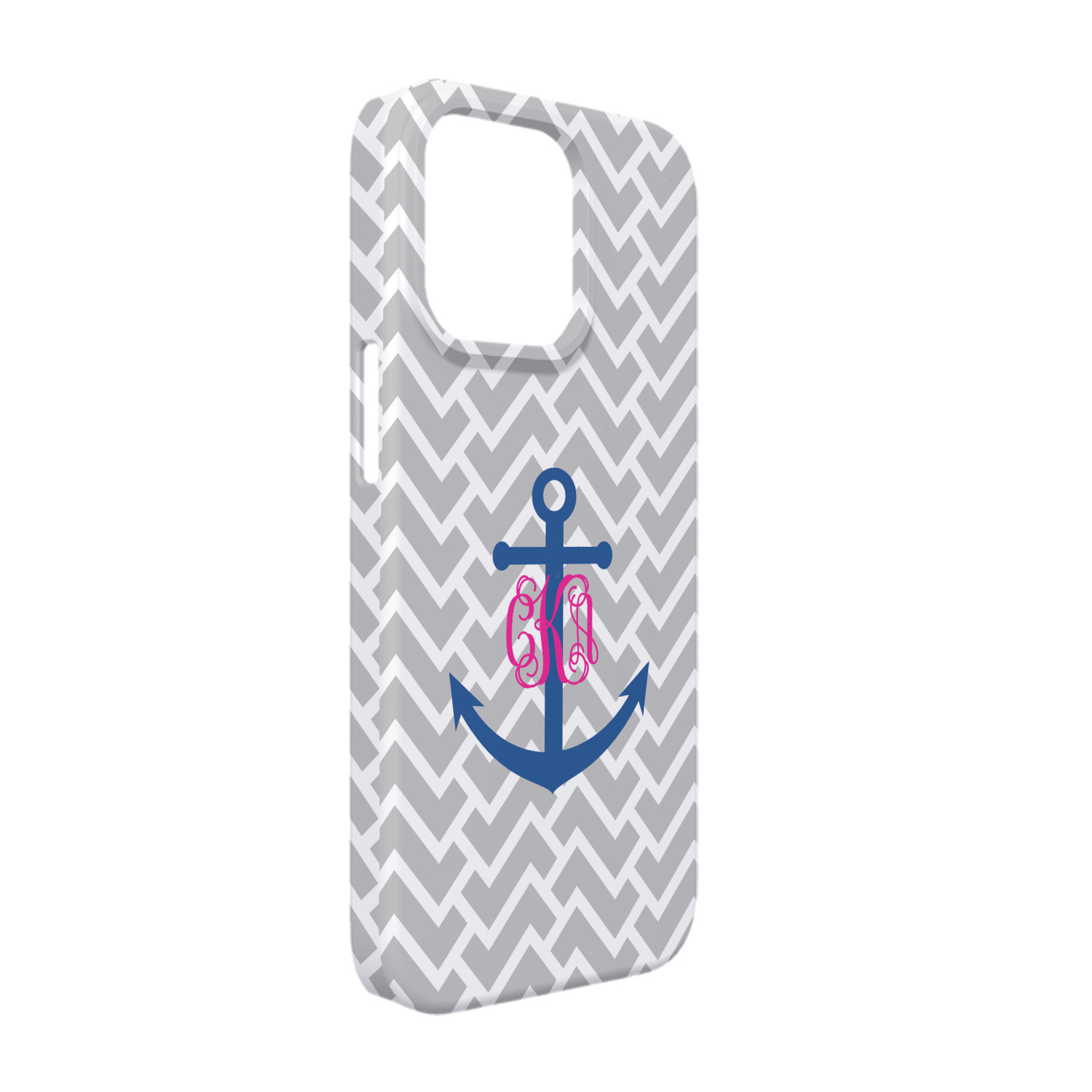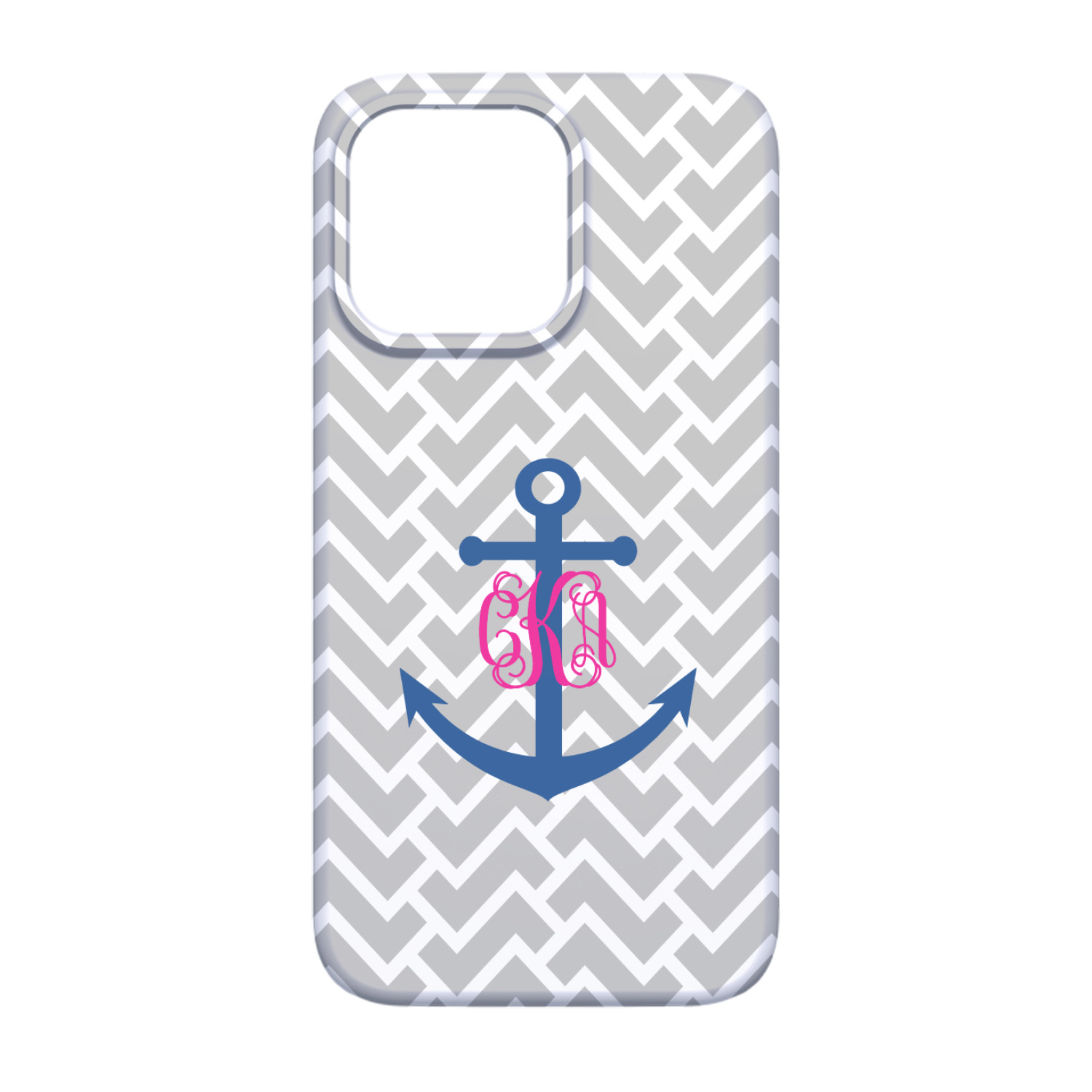This design perfect for someone who loves anchors and monograms. In this beautiful design, we features a zigzag pattern for the background. We chose a neutral light gray color. For the foreground we chose a simple anchor in blue and we added an interlocking monogram in hot pink on top of the anchor.