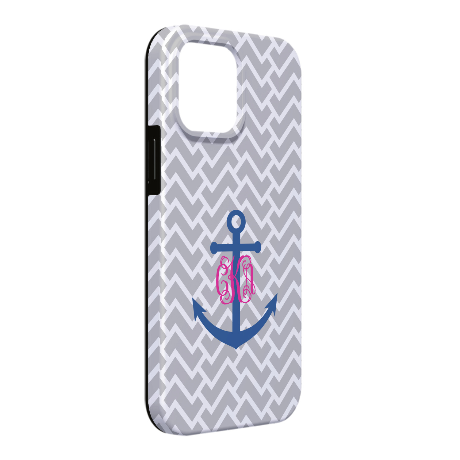 This design perfect for someone who loves anchors and monograms. In this beautiful design, we features a zigzag pattern for the background. We chose a neutral light gray color. For the foreground we chose a simple anchor in blue and we added an interlocking monogram in hot pink on top of the anchor.