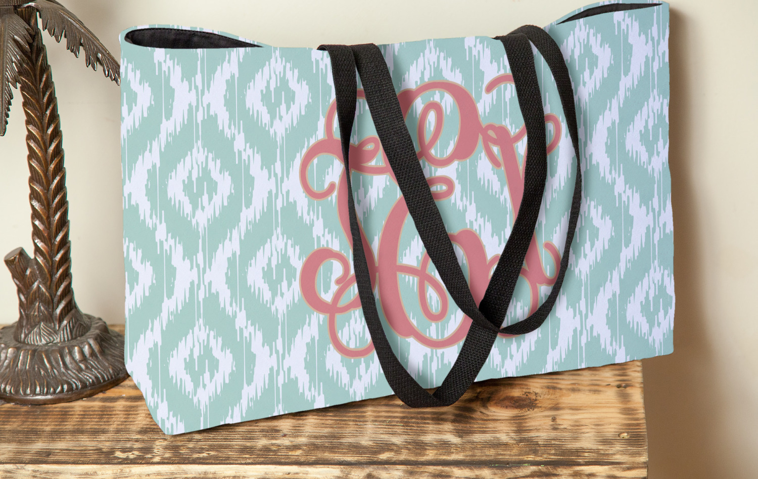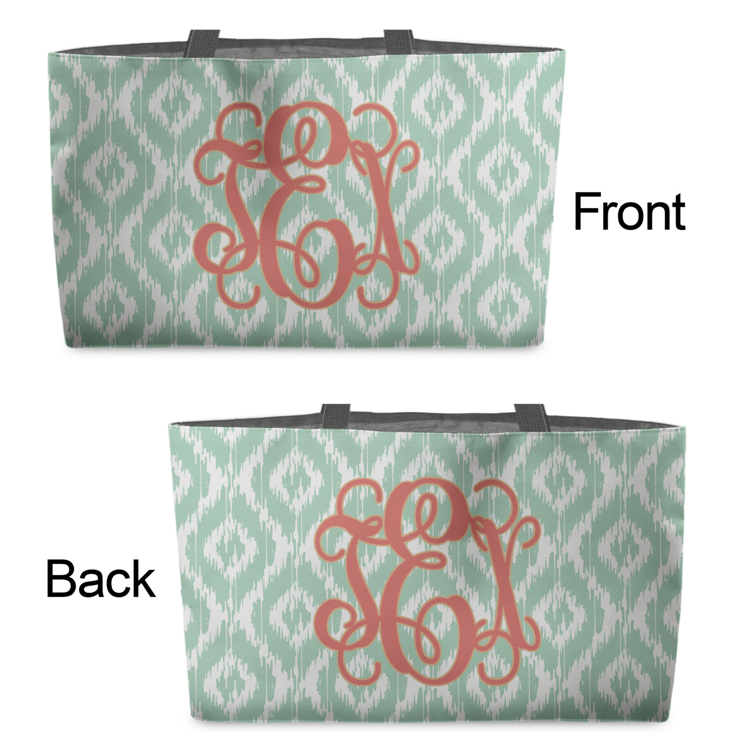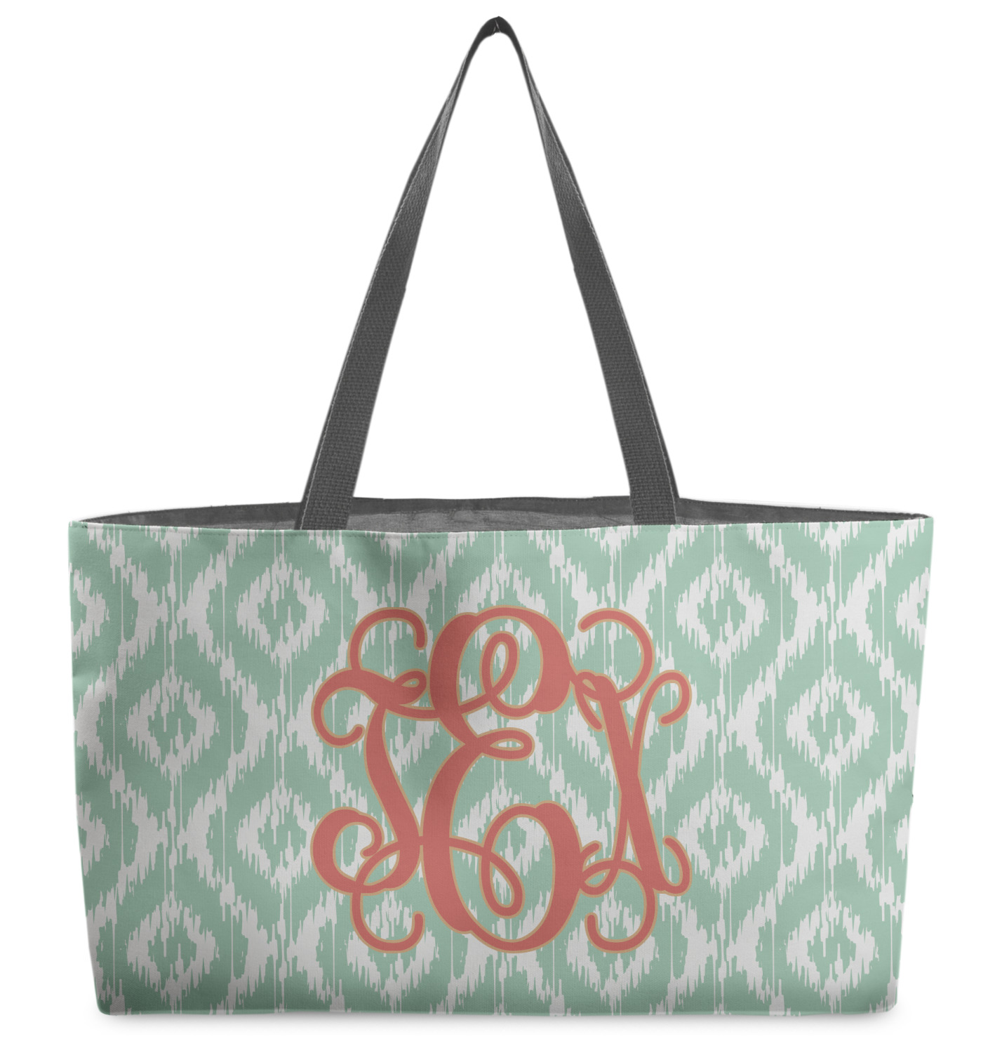 Are you a monogram-a-holic? Then, this design is perfect for you. With a subtle mint green ikat background, your monogram takes center stage in a bold coral. Let us indulge your obsession with this precious design!!