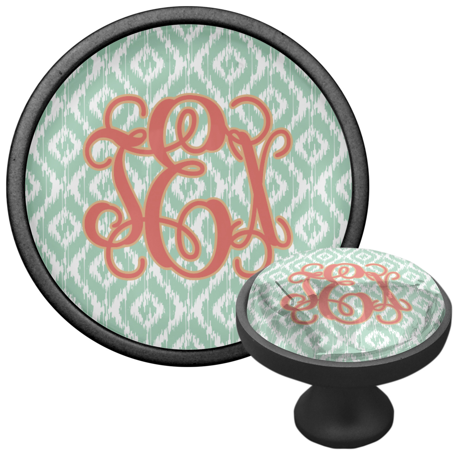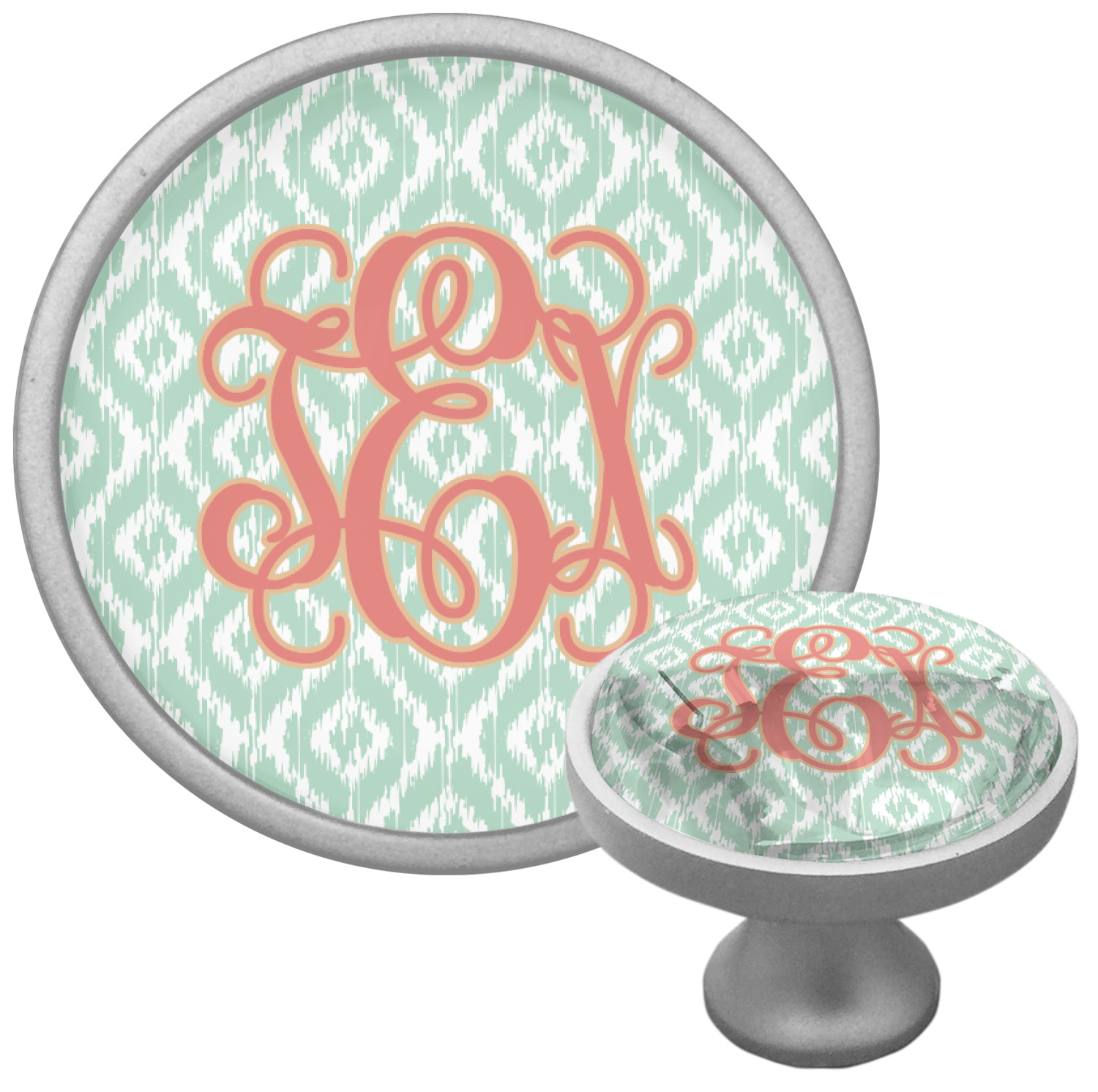 Are you a monogram-a-holic? Then, this design is perfect for you. With a subtle mint green ikat background, your monogram takes center stage in a bold coral. Let us indulge your obsession with this precious design!!