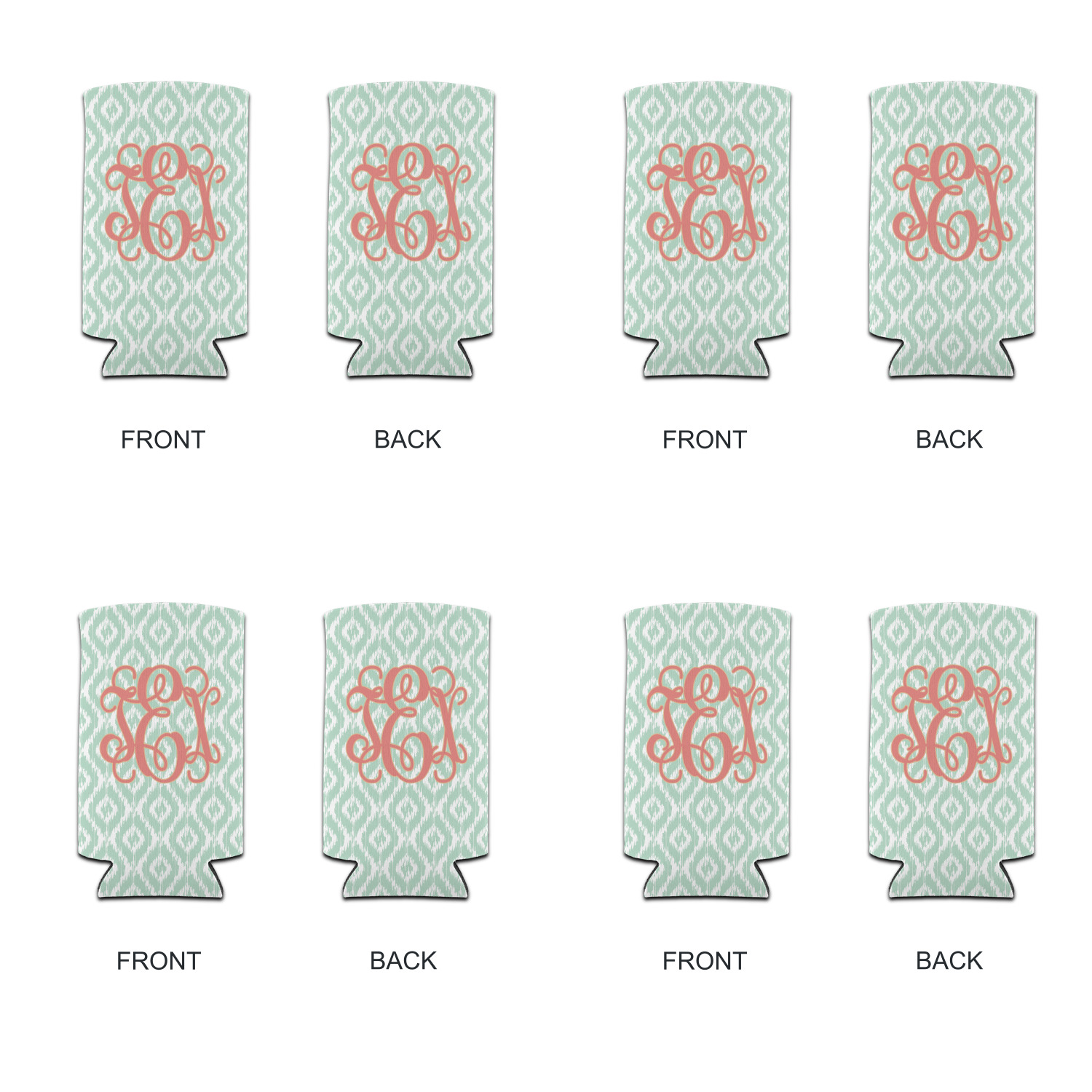 Are you a monogram-a-holic? Then, this design is perfect for you. With a subtle mint green ikat background, your monogram takes center stage in a bold coral. Let us indulge your obsession with this precious design!!