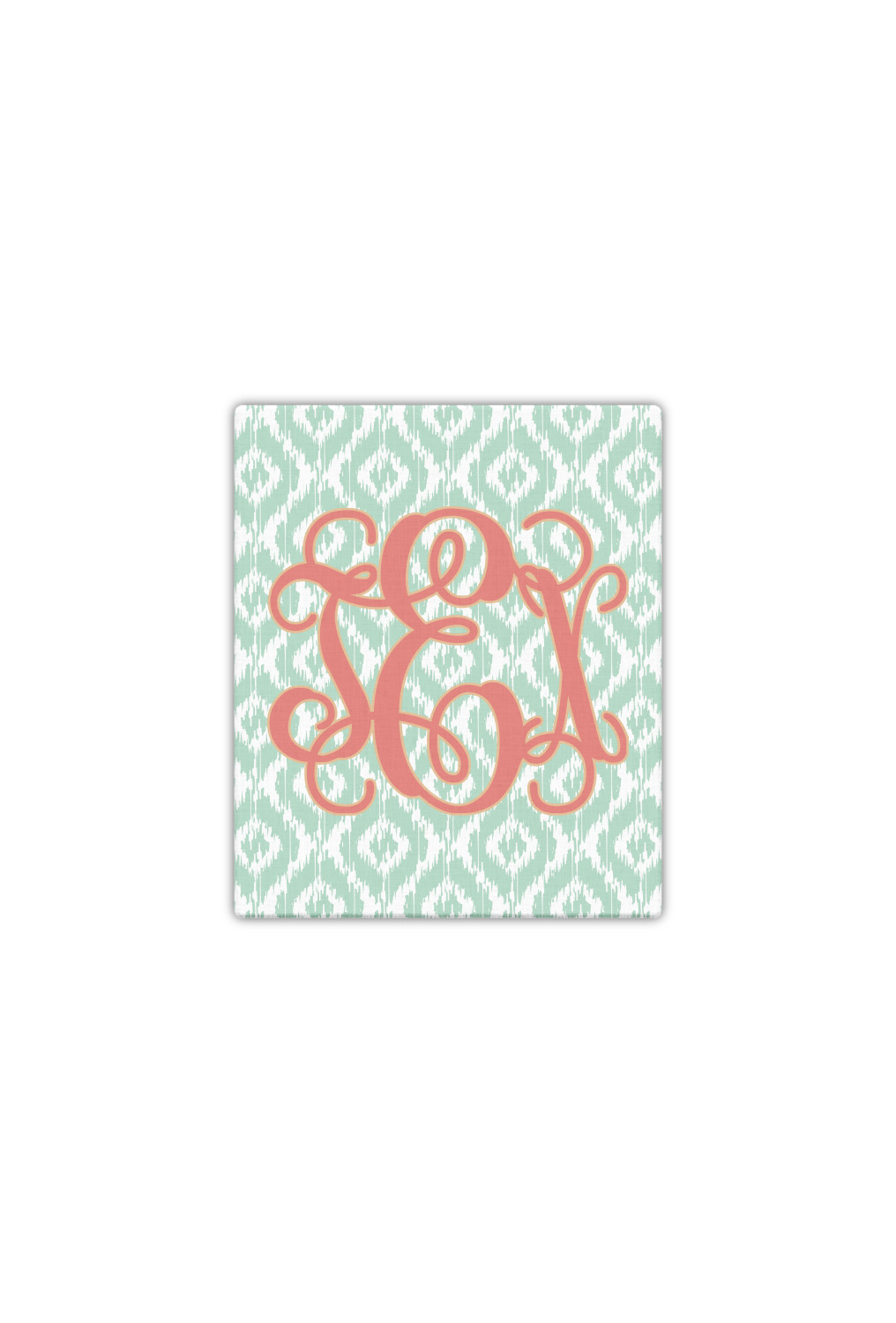 Are you a monogram-a-holic? Then, this design is perfect for you. With a subtle mint green ikat background, your monogram takes center stage in a bold coral. Let us indulge your obsession with this precious design!!
