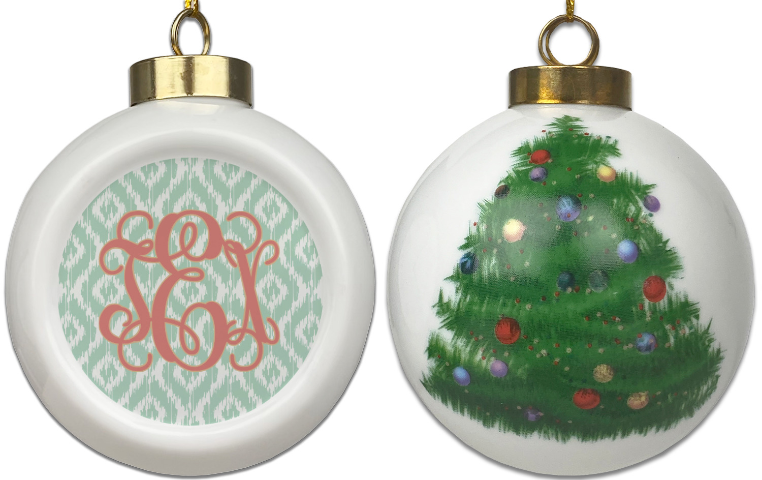 Our Christmas ornaments are a unique ceramic ball shape with a twist as it has a flat face to display your custom design! Select from one of our two design types - Christmas Tree or Poinsettia Garland - to adorn the curved back of your personal design. Each ornament measures 3H x 2.5W x 2D accompanied with a gold string accent for finishing touches to hang on your beautiful Christmas tree!