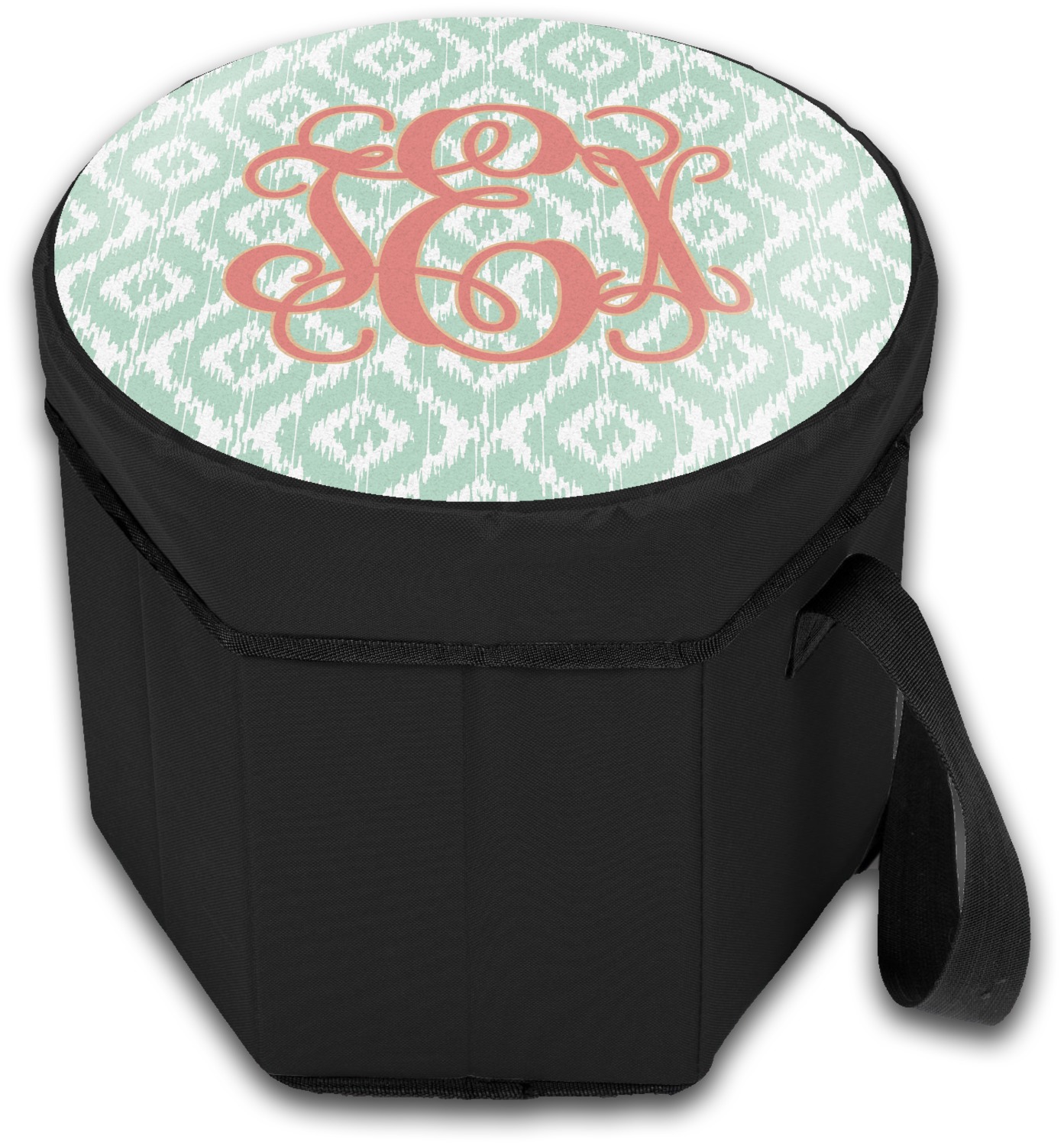 Our collapsible insulated coolers feature a unique six-sided hexagon shape, are lightweight, durable and can be turned into a seat. This cooler is fully insulated with silver foil lining to keep food and drinks hot or cold, and has a 12-quart capacity. Although this cooler collapses for easy transport, hidden inside are composition panels made of sturdy wood that give the frame strength and allow this cooler to be used as a seat. Simply sit down on the personalized cover and give your legs a break! (Maximum weight capacity of 200 pounds.)