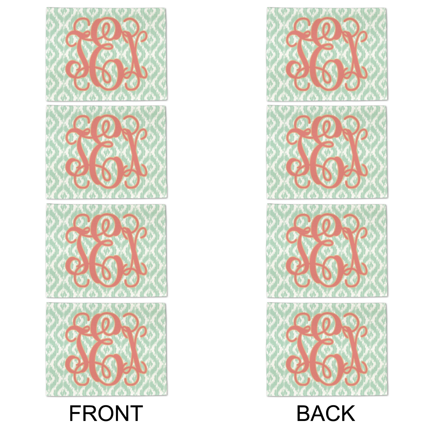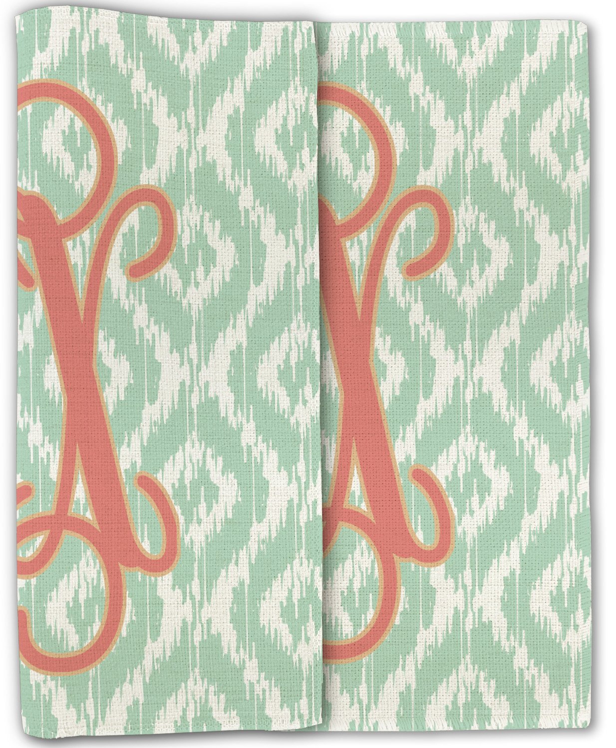 Are you a monogram-a-holic? Then, this design is perfect for you. With a subtle mint green ikat background, your monogram takes center stage in a bold coral. Let us indulge your obsession with this precious design!!