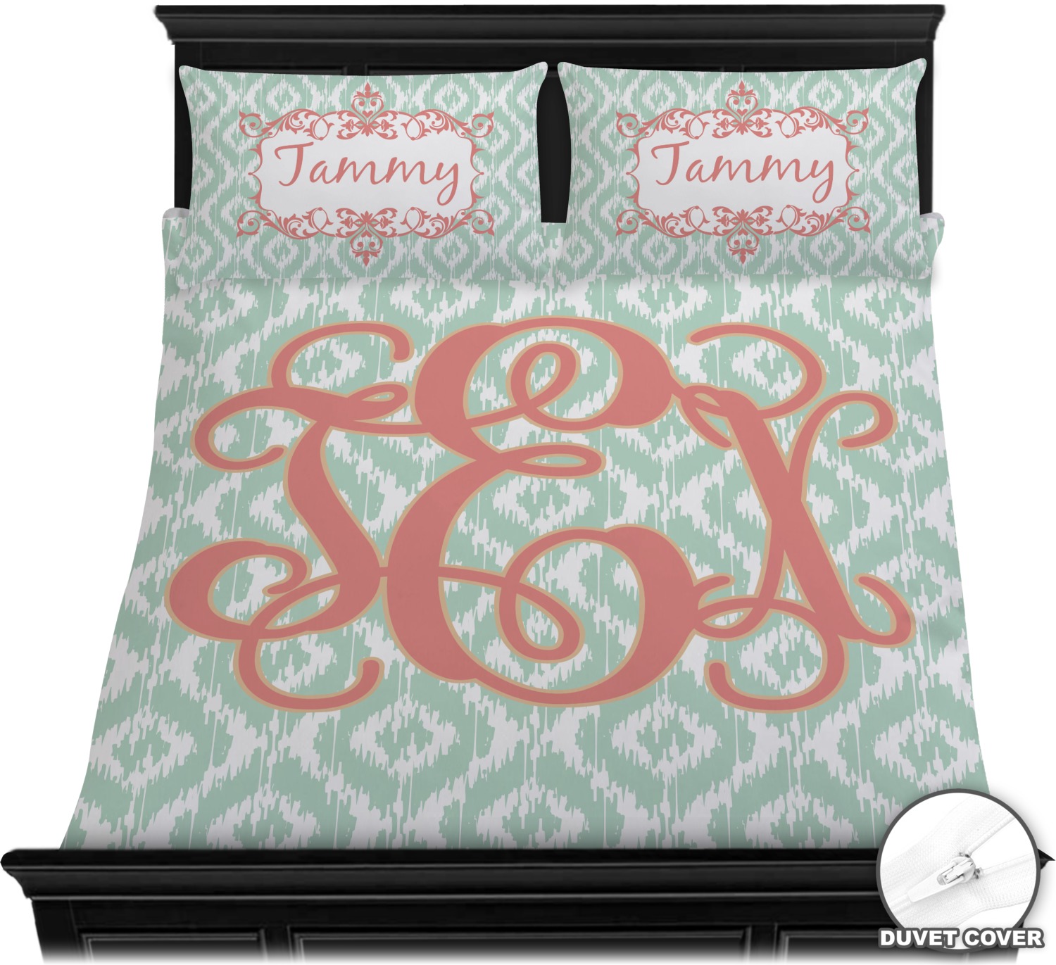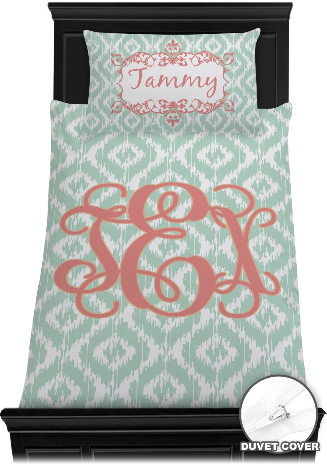 Are you a monogram-a-holic? Then, this design is perfect for you. With a subtle mint green ikat background, your monogram takes center stage in a bold coral. Let us indulge your obsession with this precious design!!