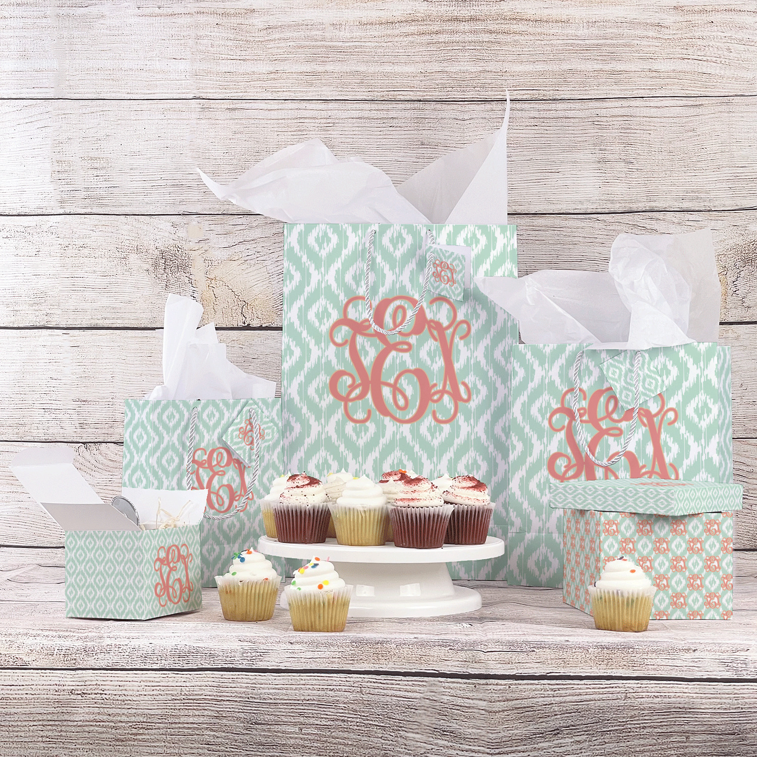Are you a monogram-a-holic? Then, this design is perfect for you. With a subtle mint green ikat background, your monogram takes center stage in a bold coral. Let us indulge your obsession with this precious design!!