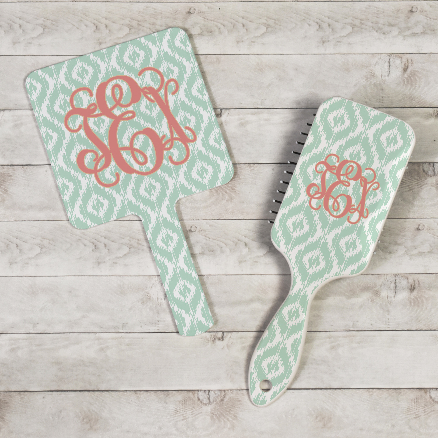 Are you a monogram-a-holic? Then, this design is perfect for you. With a subtle mint green ikat background, your monogram takes center stage in a bold coral. Let us indulge your obsession with this precious design!!